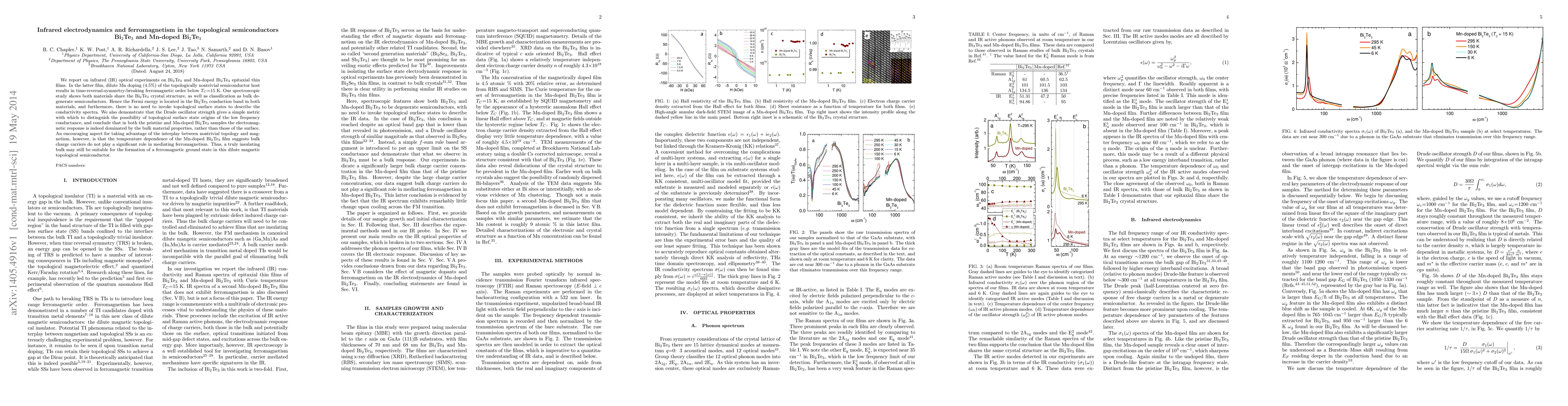 This paper investigates infrared optical properties in Bi$_2$Te$_3$ and Mn-doped Bi$_2$Te$_3$ thin films, finding that Mn doping induces ferromagnetism without altering the bulk degenerate semiconductor classification. It concludes that the electromagnetic response is dominated by bulk material properties rather than topological surface states.