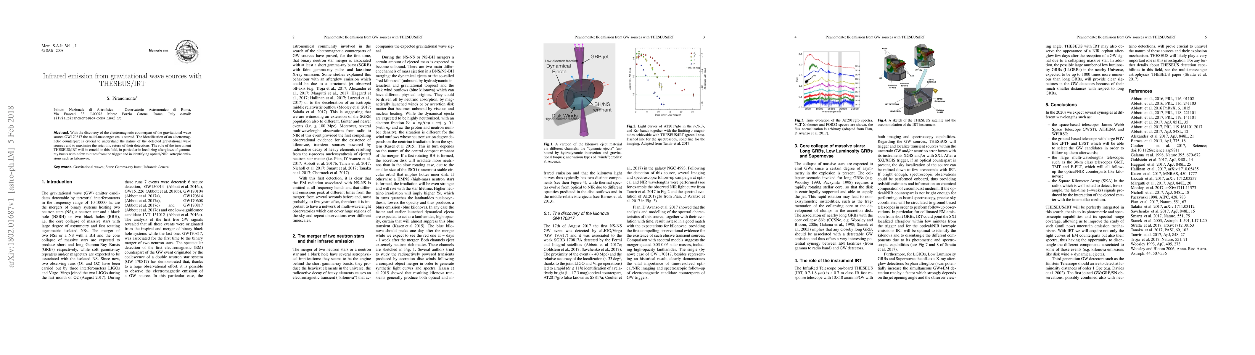 With the discovery of the electromagnetic counterpart of the gravitational wave source GW170817 the multi-messenger era is started. The identification of an electromagnetic counterpart is crucial to understand the nature of the detected gravitational wave sources and to maximize the scientific return of their detections. The role of the instrument THESEUS/IRT will be crucial in this field, in particular in localizing afterglows of gamma-ray bursts within few minutes from the trigger and in identifying optical/NIR isotropic emissions such as kilonovae.