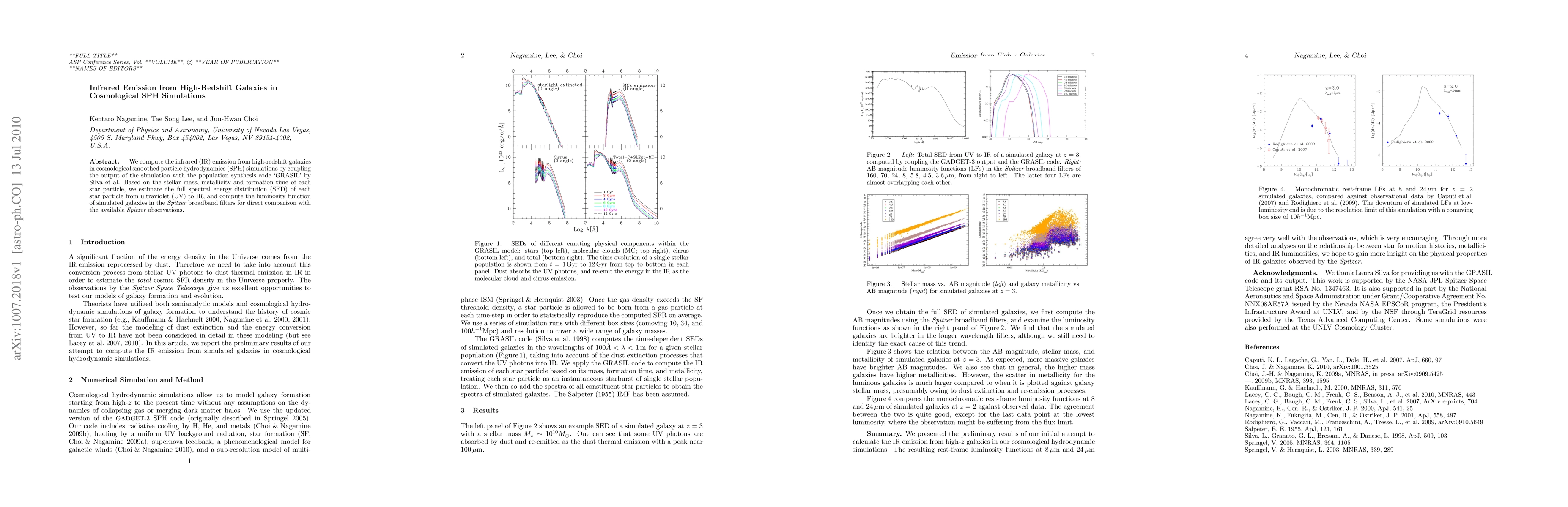 We compute the infrared (IR) emission from high-redshift galaxies in cosmological smoothed particle hydrodynamics simulations by coupling the output of the simulation with the population synthesis code `GRASIL' by Silva et al. Based on the stellar mass, metallicity and formation time of each star particle, we estimate the full spectral energy distribution of each star particle from ultraviolet to IR, and compute the luminosity function of simulated galaxies in the Spitzer broadband filters for direct comparison with the available Spitzer observations.