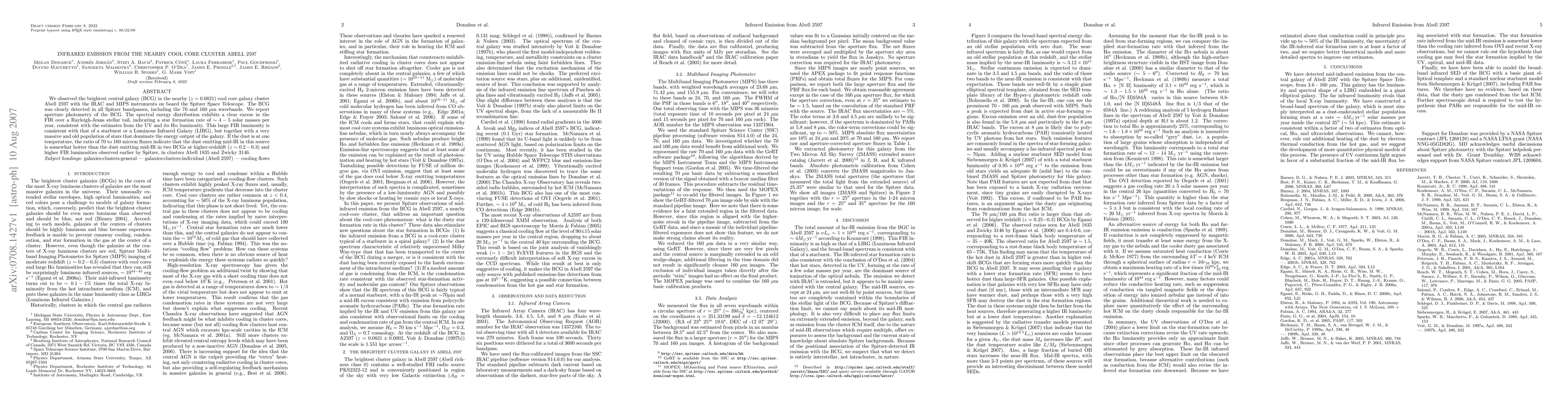 This study uses Spitzer Space Telescope data to observe the brightest central galaxy in the cool core cluster Abell 2597, finding significant infrared emission indicative of a star formation rate of ~4-5 solar masses per year. The galaxy's FIR luminosity is consistent with a starburst or LIRG, despite its old and massive stellar population.