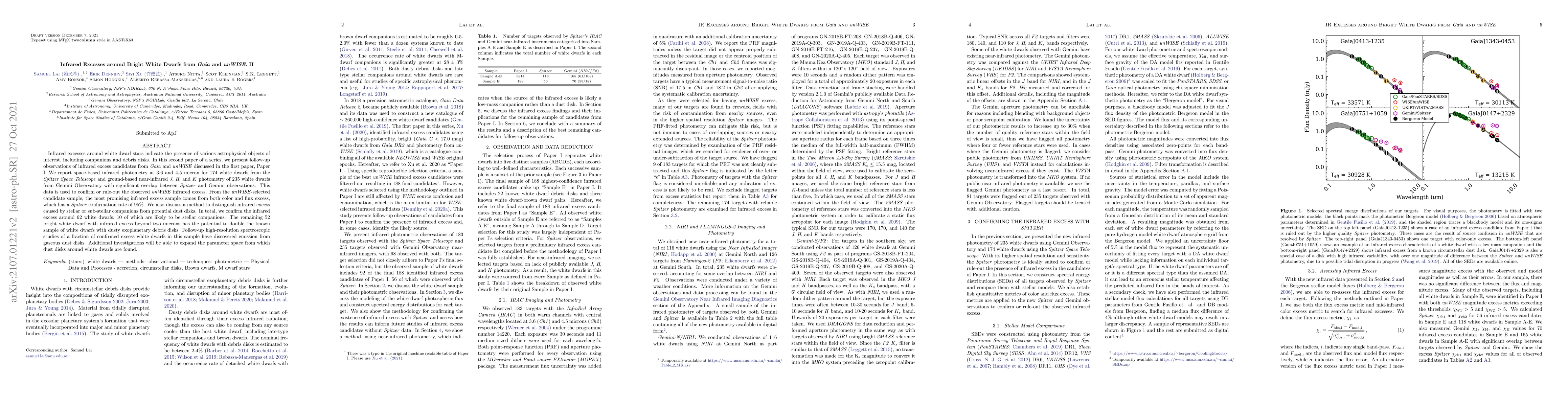 Infrared excesses around white dwarf stars indicate the presence of various astrophysical objects of interest, including companions and debris disks. In this second paper of a series, we present follow-up observations of infrared excess candidates from Gaia and unWISE discussed in the first paper, Paper I. We report space-based infrared photometry at 3.6 and 4.5 micron for 174 white dwarfs from the Spitzer Space Telescope and ground-based near-infrared J, H, and K photometry of 235 white dwarfs from Gemini Observatory with significant overlap between Spitzer and Gemini observations. This data is used to confirm or rule-out the observed unWISE infrared excess. From the unWISE-selected candidate sample, the most promising infrared excess sample comes from both colour and flux excess, which has a Spitzer confirmation rate of 95%. We also discuss a method to distinguish infrared excess caused by stellar or sub-stellar companions from potential dust disks. In total, we confirm the infrared excess around 62 white dwarfs, 10 of which are likely to be stellar companions. The remaining 52 bright white dwarf with infrared excess beyond two microns has the potential to double the known sample of white dwarfs with dusty exoplanetary debris disks. Follow-up high-resolution spectroscopic studies of a fraction of confirmed excess white dwarfs in this sample have discovered emission from gaseous dust disks. Additional investigations will be able to expand the parameter space from which dust disks around white dwarfs are found.