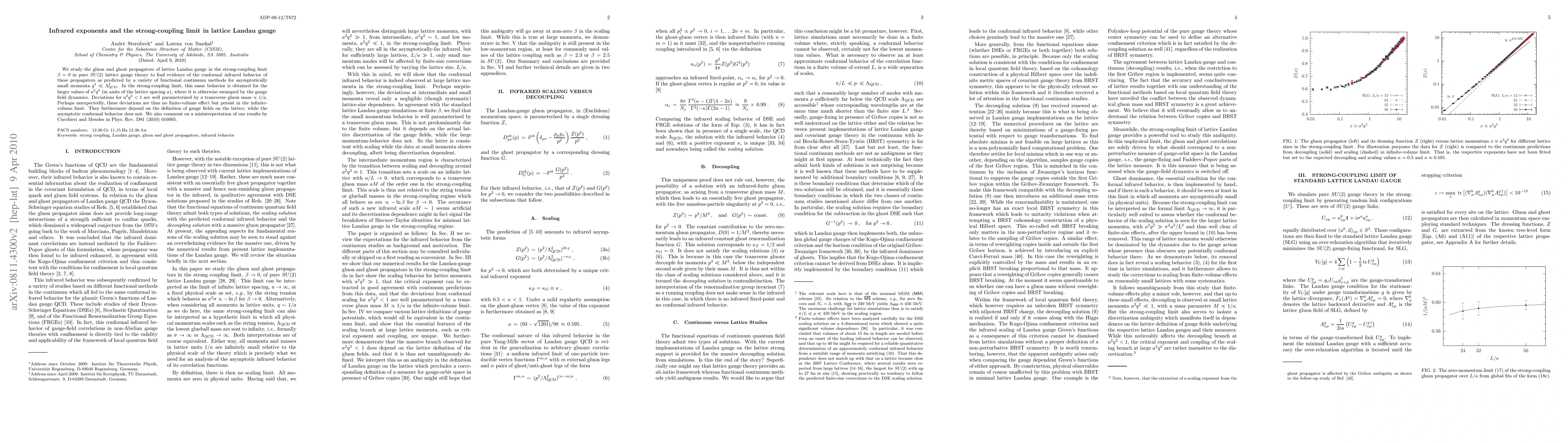 We study the gluon and ghost propagators of lattice Landau gauge in the strong-coupling limit beta=0 in pure SU(2) lattice gauge theory to find evidence of the conformal infrared behavior of these propagators as predicted by a variety of functional continuum methods for asymptotically small momenta $q^2 \ll \Lambda_\mathrm{QCD}^2$. In the strong-coupling limit, this same behavior is obtained for the larger values of a^2q^2 (in units of the lattice spacing a), where it is otherwise swamped by the gauge field dynamics. Deviations for a^2q^2 < 1 are well parameterized by a transverse gluon mass $\propto 1/a$. Perhaps unexpectedly, these deviations are thus no finite-volume effect but persist in the infinite-volume limit. They furthermore depend on the definition of gauge fields on the lattice, while the asymptotic conformal behavior does not. We also comment on a misinterpretation of our results by Cucchieri and Mendes in Phys. Rev. D81 (2010) 016005.