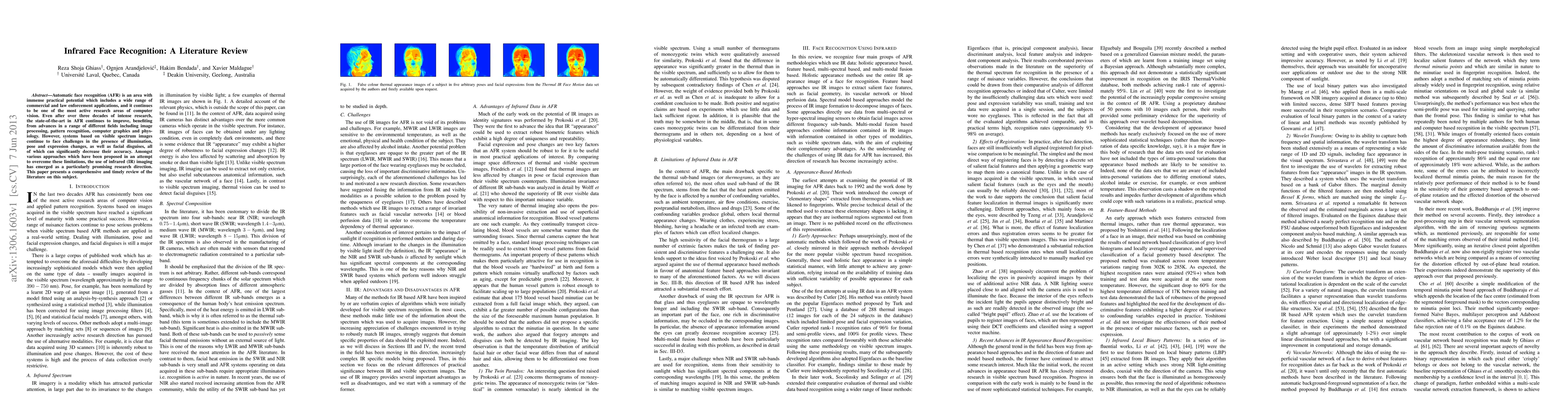 This literature review explores infrared face recognition, a promising approach to overcome visible spectrum image limitations in automatic face recognition. It highlights the technology's potential in addressing challenges like illumination, pose, expression, and disguise variations, while acknowledging ongoing research advancements in related fields.
