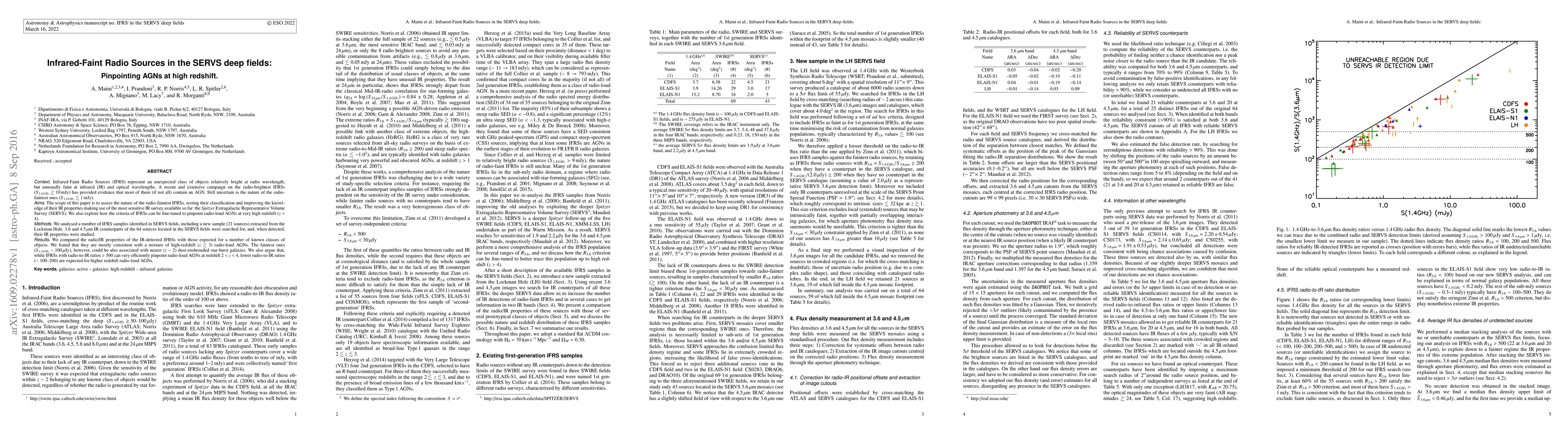 This paper investigates Infrared-Faint Radio Sources (IFRS) in the SERVS deep fields to identify high-redshift AGNs. The study finds that most IFRSs likely contain AGNs, with faintest IFRSs potentially representing dust-enshrouded star-burst galaxies at lower redshifts, while higher radio-to-IR ratios indicate AGNs at redshifts 2 < z < 4.