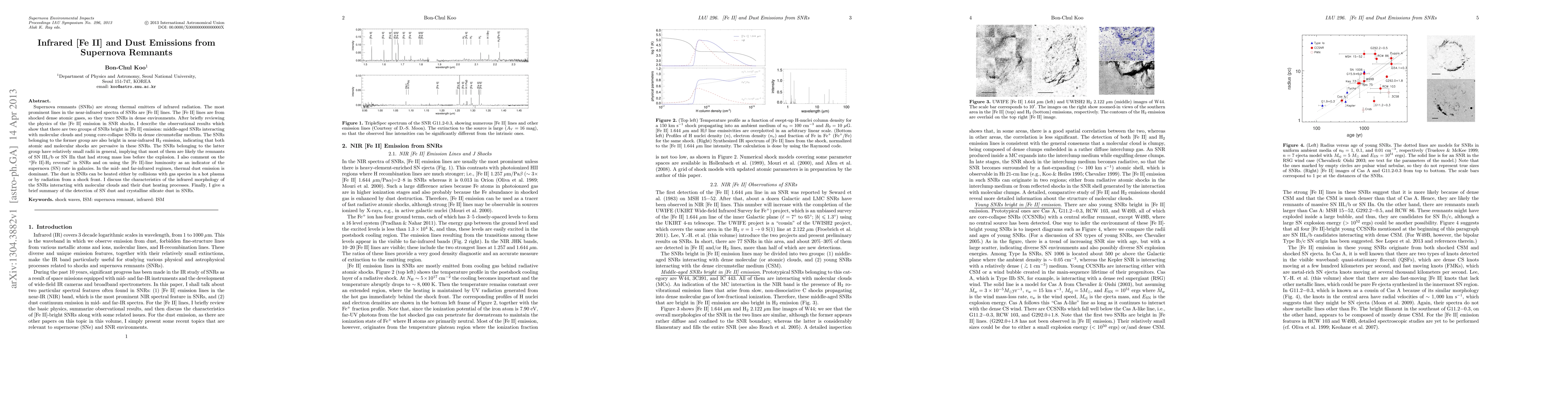 This paper examines infrared [Fe II] emissions and dust emissions in supernova remnants (SNRs), identifying two groups: middle-aged SNRs interacting with molecular clouds and young core-collapse SNRs in dense circumstellar mediums. It also discusses the dust heating processes and the detection of supernova dust and crystalline silicates in SNRs.