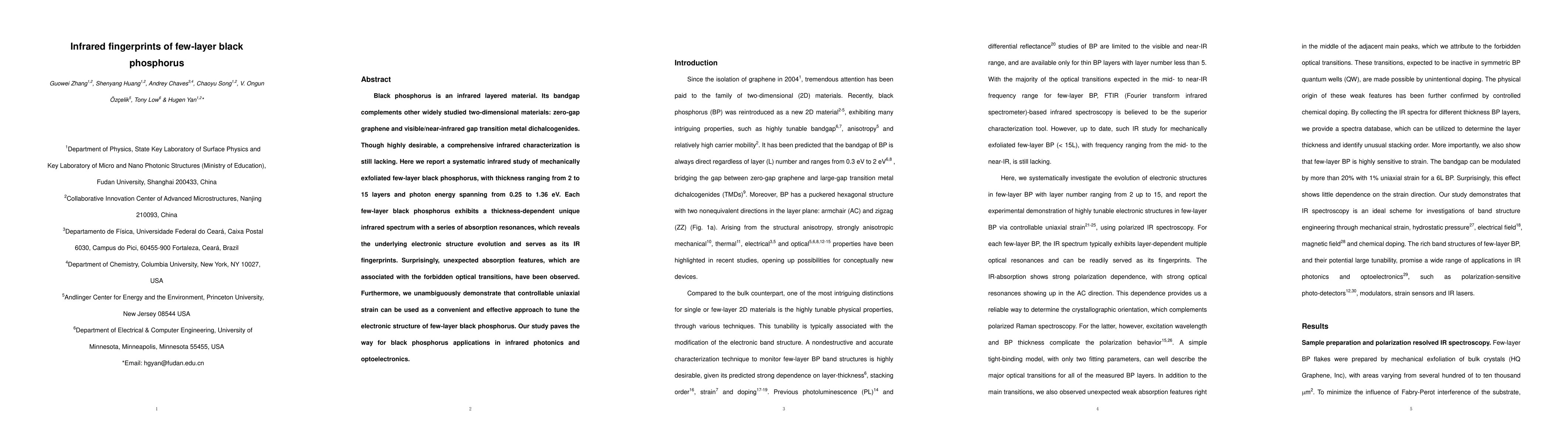 This paper presents a comprehensive infrared study of few-layer black phosphorus, revealing thickness-dependent absorption resonances that serve as infrared fingerprints. It identifies unexpected absorption features linked to forbidden optical transitions and demonstrates that uniaxial strain can tune its electronic structure, paving the way for its use in infrared photonics and optoelectronics.