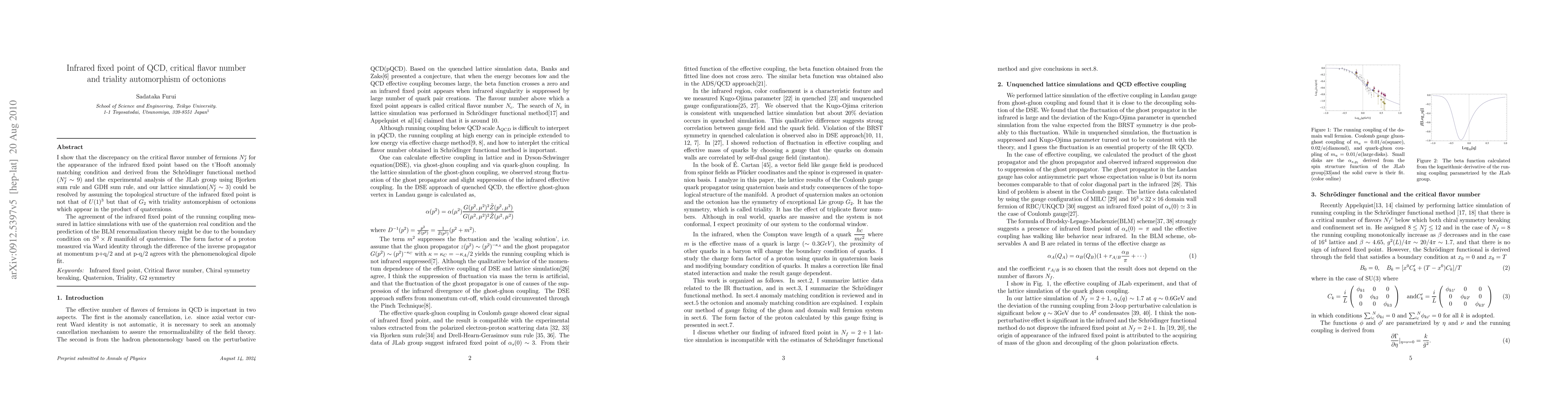 We show that the discrepancy on the critical flavor number of fermions $N_f^c$ for the appearance of the infrared fixed point based on the t'Hooft anomaly matching condition and derived from the Schr\"odinger functional method ($N_f^c\sim 9)$ and the experimental analysis of the JLab group using Bjorken sum rule and GDH sum rule, and our lattice simulation($N_f^c\sim 3$) could be resolved by assuming the topological structure of the infrared fixed point is not that of $U(1)^3$ but that of $G_2$ with triality automorphism of octonions which appear in the product of quaternions. The agreement of the infrared fixed point of the running coupling measured in lattice simulations with use of the quaternion real condition and the prediction of the BLM renormalization theory might be due to the boundary condition on $S^3\times R$ manifold of quaternion. The form factor of a proton measured via Ward identity through the difference of the inverse propagator at momentum p+q/2 and at p-q/2 agrees with the phenomenological dipole fit.