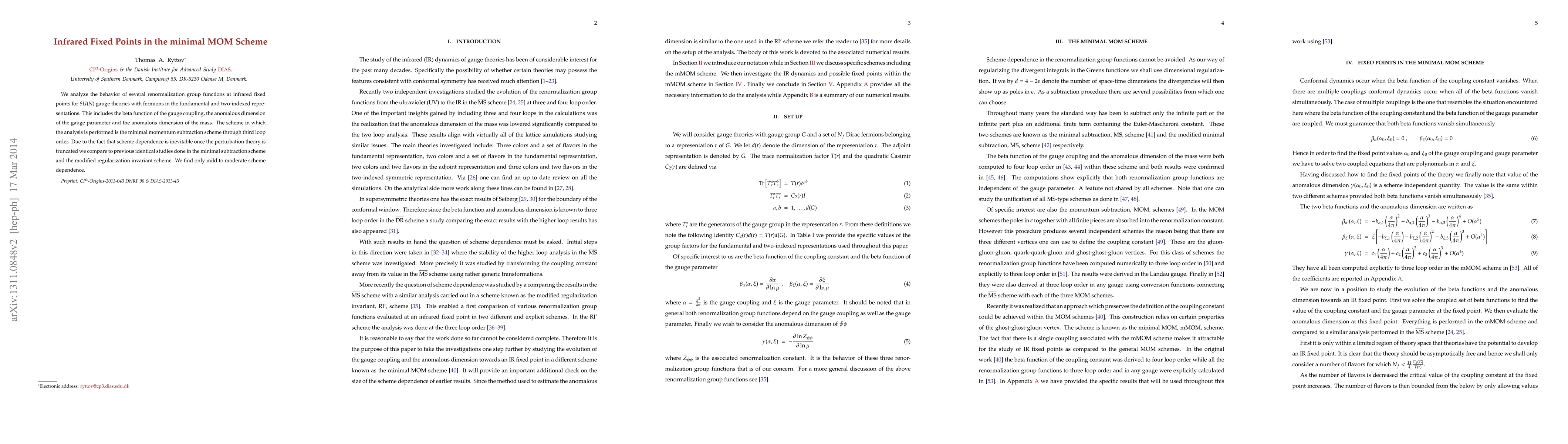 We analyze the behavior of several renormalization group functions at infrared fixed points for $SU(N)$ gauge theories with fermions in the fundamental and two-indexed representations. This includes the beta function of the gauge coupling, the anomalous dimension of the gauge parameter and the anomalous dimension of the mass. The scheme in which the analysis is performed is the minimal momentum subtraction scheme through third loop order. Due to the fact that scheme dependence is inevitable once the perturbation theory is truncated we compare to previous identical studies done in the minimal subtraction scheme and the modified regularization invariant scheme. We find only mild to moderate scheme dependence.