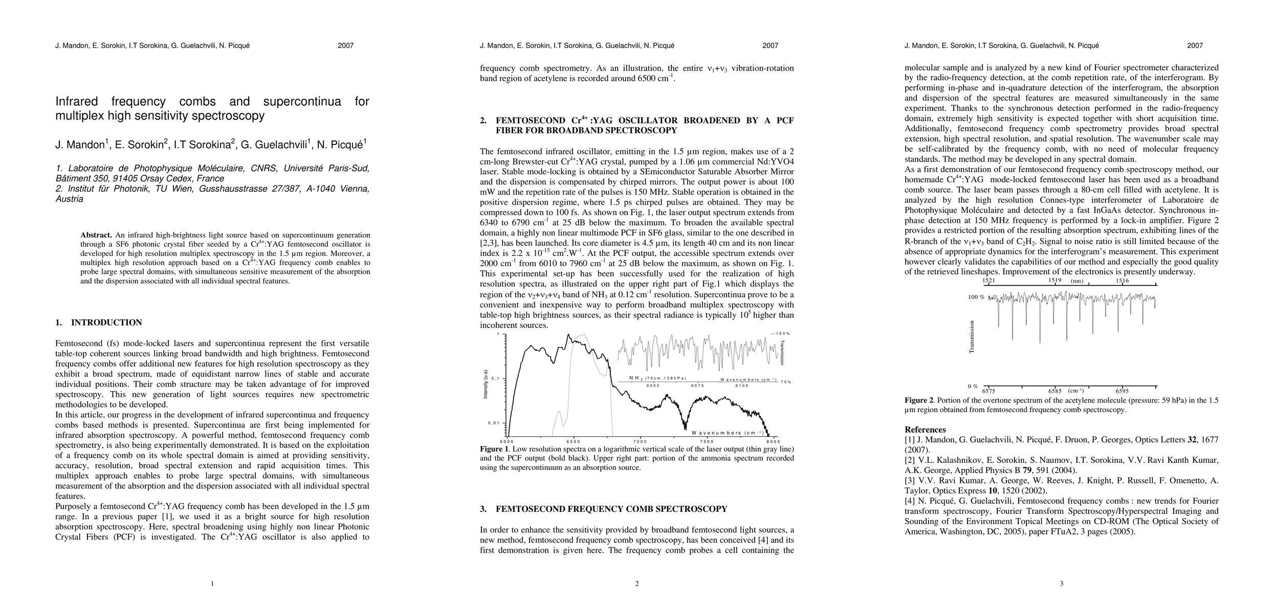An infrared high-brightness light source based on supercontinuum generation through a SF6 photonic crystal fiber seeded by a Cr^4+:YAG femtosecond oscillator is developed for high resolution multiplex spectroscopy in the 1.5 $\mu$m region. Moreover, a multiplex high resolution approach based on a Cr^4+:YAG frequency comb enables to probe large spectral domains, with simultaneous sensitive measurement of the absorption and the dispersion associated with all individual spectral features.