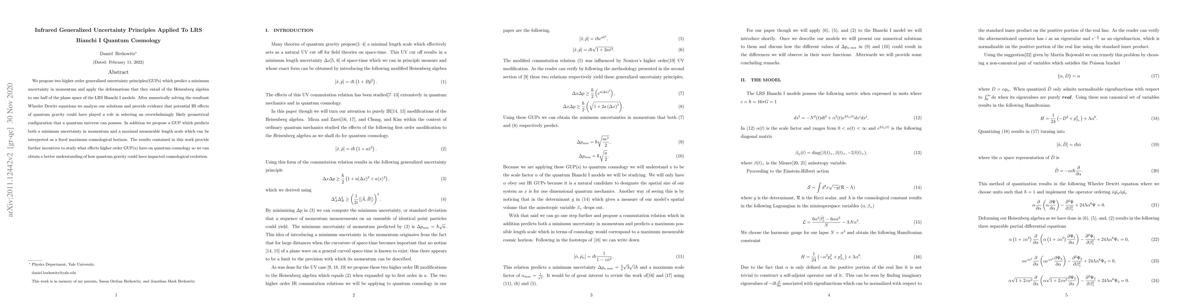 Researchers propose two generalized uncertainty principles that predict minimum uncertainties in momentum for LRS Bianchi I models, suggesting potential IR effects of quantum gravity influenced cosmological evolution. The findings suggest a need to study higher-order GUPs on quantum cosmology to better understand the impact of quantum gravity on cosmological evolution.