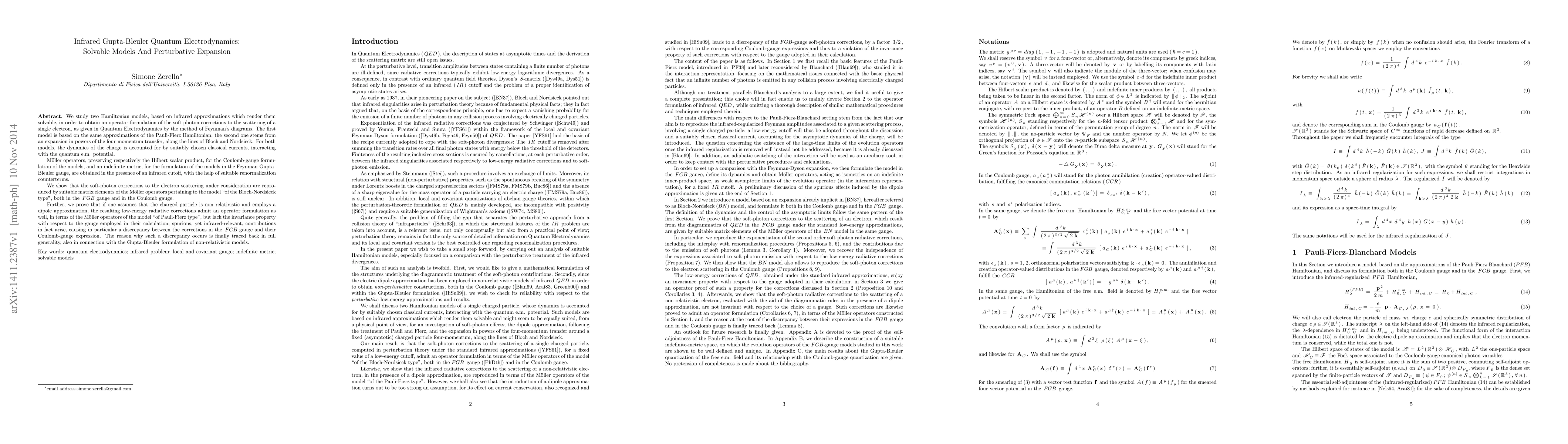 This paper explores two solvable Hamiltonian models in infrared Gupta-Bleuler Quantum Electrodynamics to derive operator formulations for soft-photon corrections in electron scattering. It demonstrates that the Bloch-Nordsieck model reproduces these corrections in both Coulomb and Feynman-Gupta-Bleuler gauges, while the Pauli-Fierz model provides a non-relativistic operator formulation lacking gauge invariance.