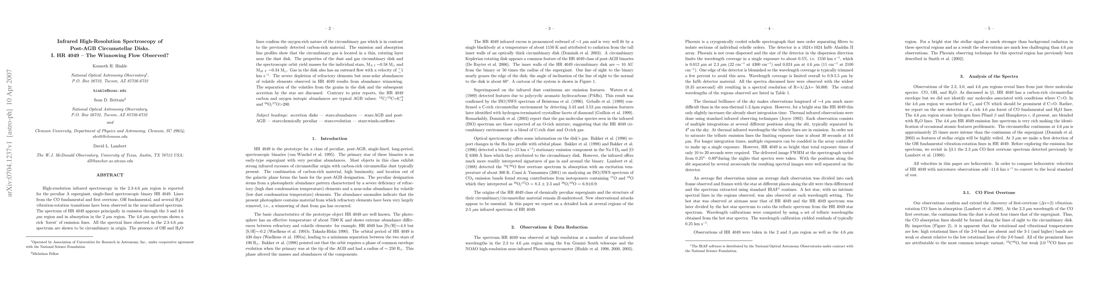 High-resolution infrared spectroscopy in the 2.3-4.6 micron region is reported for the peculiar A supergiant, single-lined spectroscopic binary HR 4049. Lines from the CO fundamental and first overtone, OH fundamental, and several H2O vibration-rotation transitions have been observed in the near-infrared spectrum. The spectrum of HR 4049 appears principally in emission through the 3 and 4.6 micron region and in absorption in the 2 micron region. The 4.6 micron spectrum shows a rich 'forest' of emission lines. All the spectral lines observed in the 2.3-4.6 micron spectrum are shown to be circumbinary in origin. The presence of OH and H2O lines confirm the oxygen-rich nature of the circumbinary gas which is in contrast to the previously detected carbon-rich material. The emission and absorption line profiles show that the circumbinary gas is located in a thin, rotating layer near the dust disk. The properties of the dust and gas circumbinary disk and the spectroscopic orbit yield masses for the individual stars, M_AI~0.58 Msolar and M_MV~0.34 Msolar. Gas in the disk also has an outward flow with a velocity of $\gtrsim$ 1 km/s. The severe depletion of refractory elements but near-solar abundances of volatile elements observed in HR 4049 results from abundance winnowing. The separation of the volatiles from the grains in the disk and the subsequent accretion by the star are discussed. Contrary to prior reports, the HR 4049 carbon and oxygen isotopic abundances are typical AGB values: 12C/13C=6^{+9}_{-4} and 16O/17O>200.