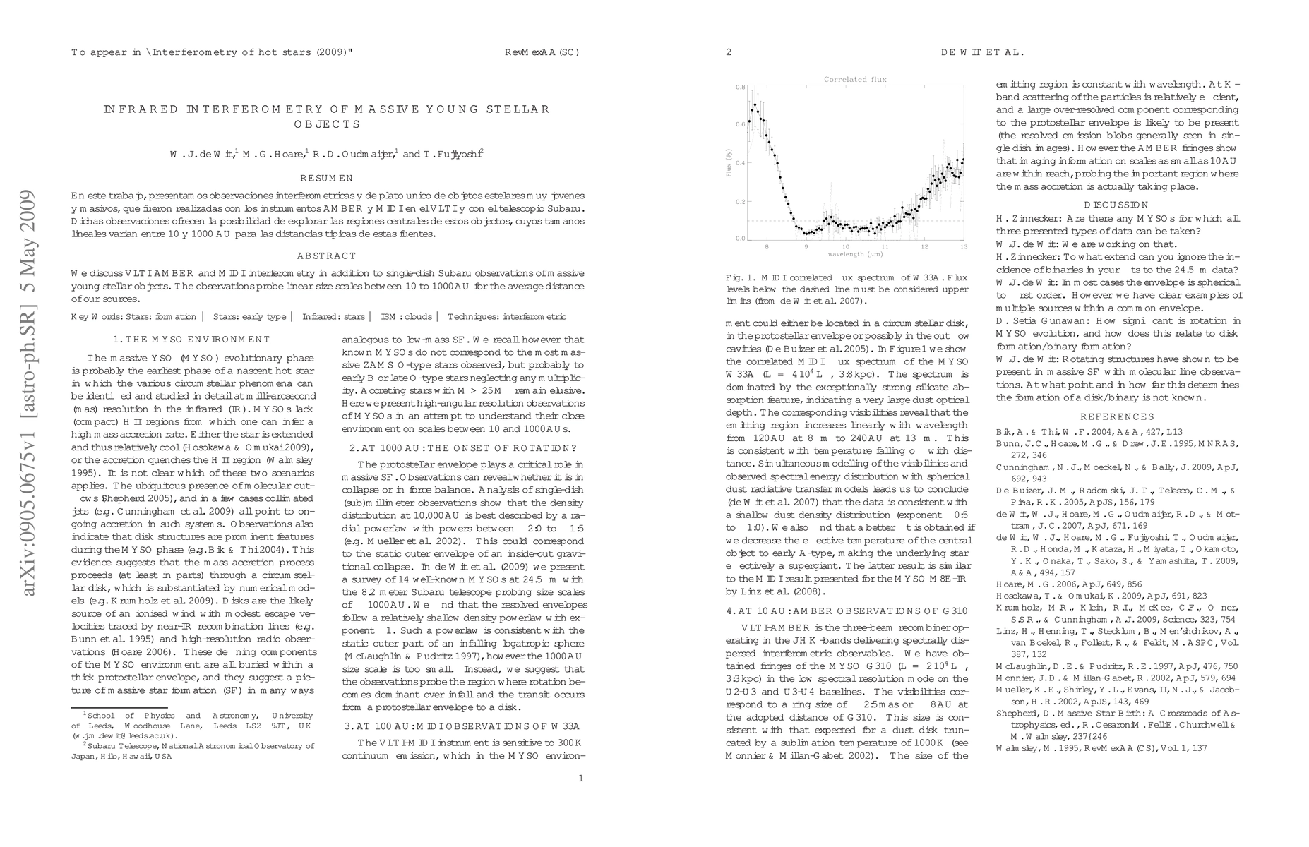 This paper utilizes VLTI AMBER and MIDI interferometry along with Subaru single-dish observations to study massive young stellar objects, focusing on linear size scales between 10 to 1000 AU. The research aims to understand the structure and formation processes of these objects.