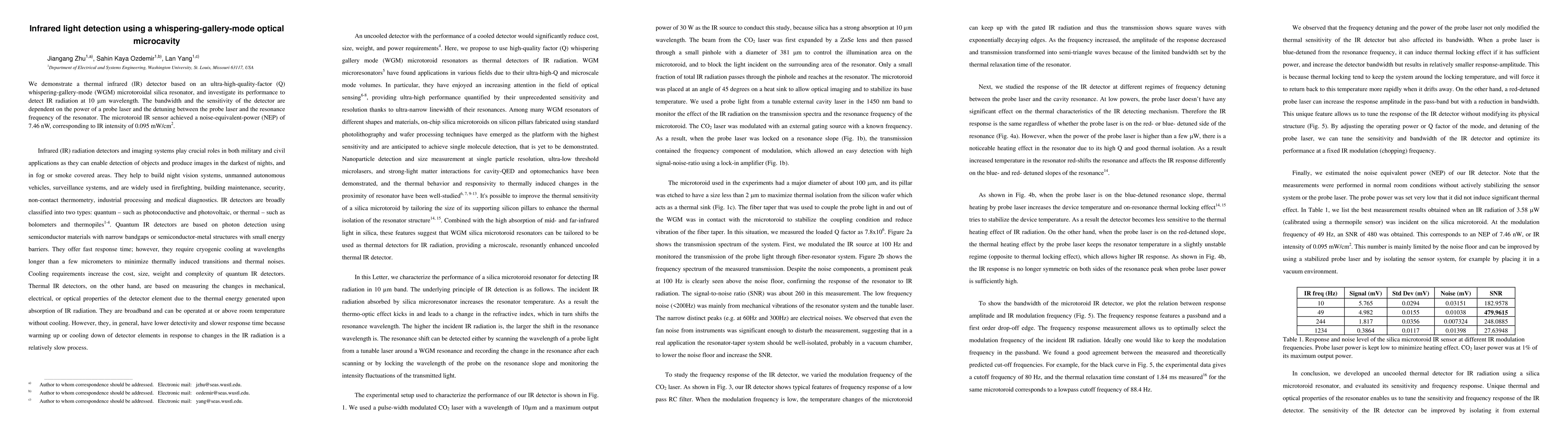This paper presents a thermal infrared detector utilizing a high-quality-factor whispering-gallery-mode microtoroidal silica resonator, achieving a noise-equivalent-power of 7.46 nW for IR radiation at 10 microns, demonstrating its sensitivity and bandwidth performance.