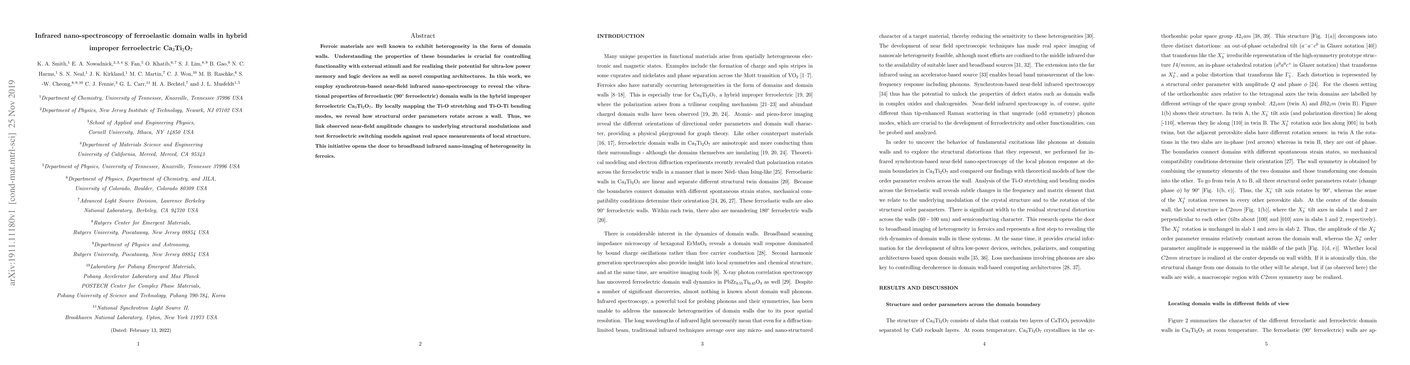 Ferroic materials are well known to exhibit heterogeneity in the form of domain walls. Understanding the properties of these boundaries is crucial for controlling functionality with external stimuli and for realizing their potential for ultra-low power memory and logic devices as well as novel computing architectures. In this work, we employ synchrotron-based near-field infrared nano-spectroscopy to reveal the vibrational properties of ferroelastic (90$^\circ$ ferroelectric) domain walls in the hybrid improper ferroelectric Ca$_3$Ti$_2$O$_7$. By locally mapping the Ti-O stretching and Ti-O-Ti bending modes, we reveal how structural order parameters rotate across a wall. Thus, we link observed near-field amplitude changes to underlying structural modulations and test ferroelectric switching models against real space measurements of local structure. This initiative opens the door to broadband infrared nano-imaging of heterogeneity in ferroics.