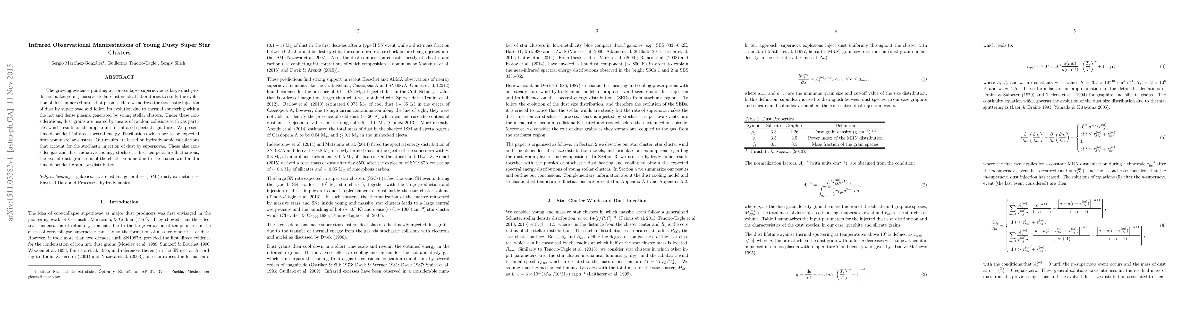 The growing evidence pointing at core-collapse supernovae as large dust producers makes young massive stellar clusters ideal laboratories to study the evolution of dust immersed into a hot plasma. Here we address the stochastic injection of dust by supernovae and follow its evolution due to thermal sputtering within the hot and dense plasma generated by young stellar clusters. Under these considerations, dust grains are heated by means of random collisions with gas particles which results on the appearance of infrared spectral signatures. We present time-dependent infrared spectral energy distributions which are to be expected from young stellar clusters. Our results are based on hydrodynamic calculations that account for the stochastic injection of dust by supernovae. These also consider gas and dust radiative cooling, stochastic dust temperature fluctuations, the exit of dust grains out of the cluster volume due to the cluster wind and a time-dependent grain size distribution.