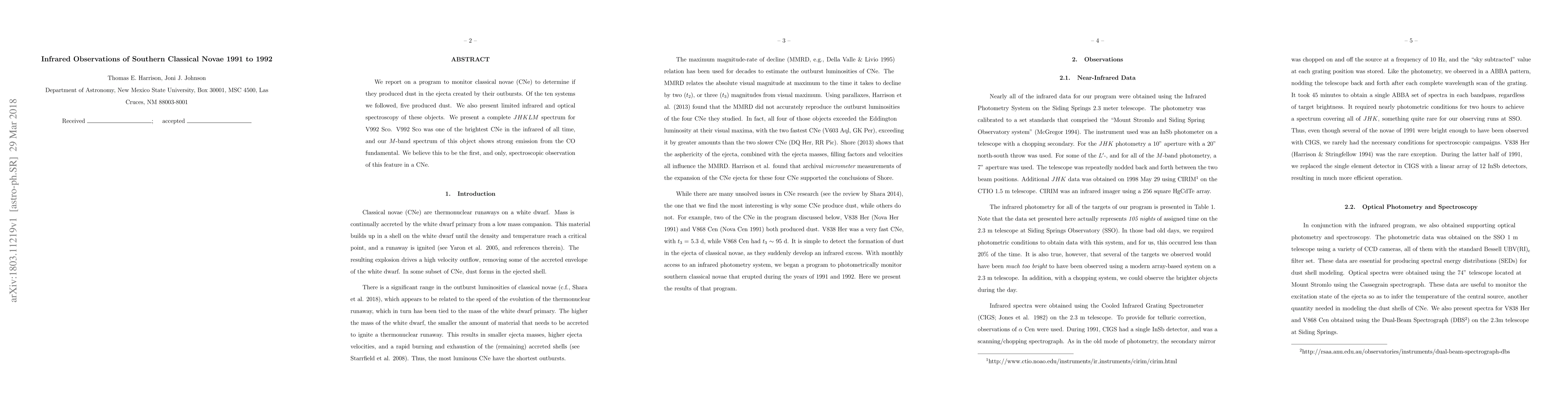 We report on a program to monitor classical novae (CNe) to determine if they produced dust in the ejecta created by their outbursts. Of the ten systems we followed, five produced dust. We also present limited infrared and optical spectroscopy of these objects. We present a complete $JHKLM$ spectrum for V992 Sco. V992 Sco was one of the brightest CNe in the infrared of all time, and our $M$-band spectrum of this object shows strong emission from the CO fundamental. We believe this to be the first, and only, spectroscopic observation of this feature in a CNe.