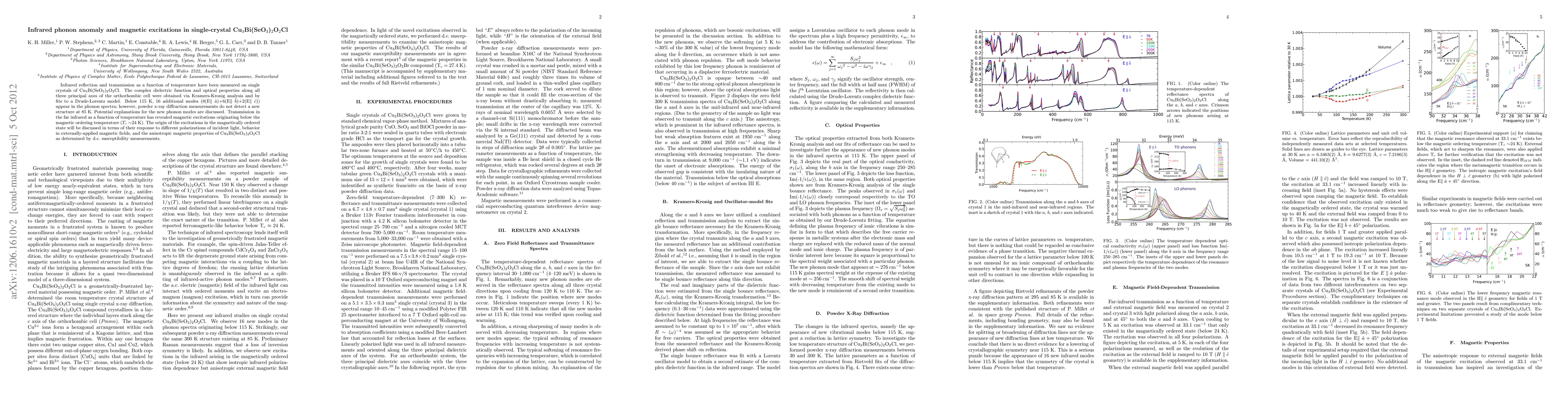 Infrared reflection and transmission as a function of temperature have been measured on single crystals of Cu$_{3}$Bi(SeO$_{3}$)$_{2}$O$_{2}$Cl. The complex dielectric function and optical properties along all three principal axes of the orthorhombic cell were obtained via Kramers-Kronig analysis and by fits to a Drude-Lorentz model. Below 115 K, 16 additional modes (8(E$\parallel\hat{a}$)+6(E$\parallel\hat{b}$)+2(E$\parallel\hat{c}$)) appear in the phonon spectra; however, powder x-ray diffraction measurements do not detect a new structure at 85 K. Potential explanations for the new phonon modes are discussed. Transmission in the far infrared as a function of temperature has revealed magnetic excitations originating below the magnetic ordering temperature ($T_{c}\sim$24 K). The origin of the excitations in the magnetically ordered state will be discussed in terms of their response to different polarizations of incident light, behavior in externally-applied magnetic fields, and the anisotropic magnetic properties of Cu$_{3}$Bi(SeO$_{3}$)$_{2}$O$_{2}$Cl as determined by d.c. susceptibility measurements.
