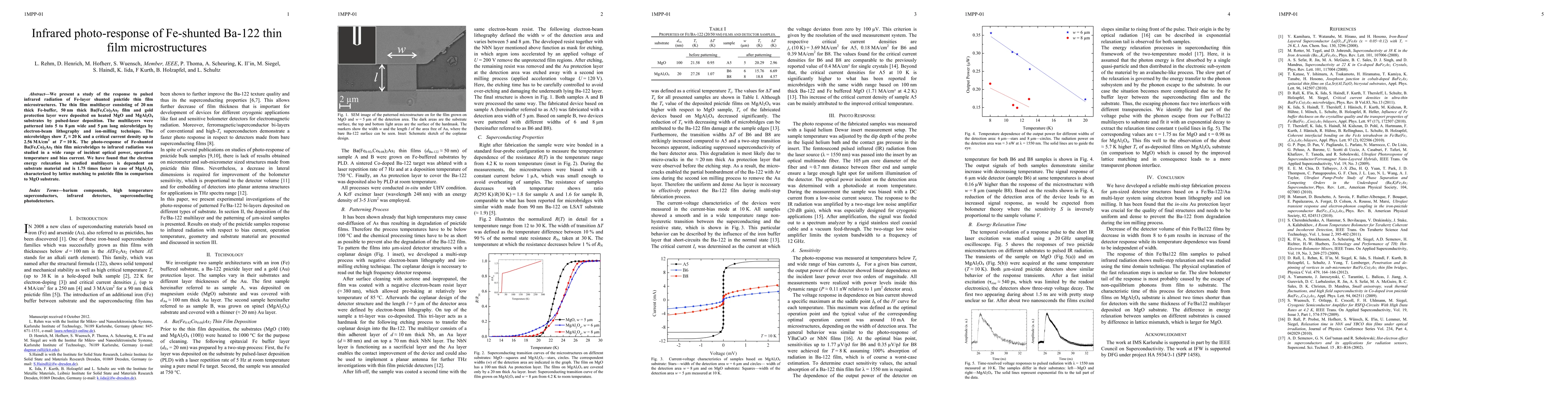 We present a study of the response to pulsed infrared radiation of Fe-layer shunted pnictide thin film microstructures. The thin film multilayer consisting of 20 nm thick Fe-buffer, 50 nm thick Ba(Fe,Co)2As2 film and gold protection layer were deposited on heated MgO and MgAl2O4 substrates by pulsed-laser deposition. The multilayers were patterned into 5 to 8 um wide and 5 um long microbridges by electron-beam lithography and ion-milling technique. The microbridges show Tc up to 20 K and a critical current density up to 2.56 MA/cm2 at T = 10 K. The photo-response of Fe-shunted Ba(Fe,Co)2As2 thin film microbridges to infrared radiation was studied in a wide range of incident optical power, operation temperature and bias current. We have found that the electron energy relaxation in studied multilayers is dependent on substrate material and is 1.75 times faster in case of MgAl2O4 characterized by lattice matching to pnictide film in comparison to MgO substrate.