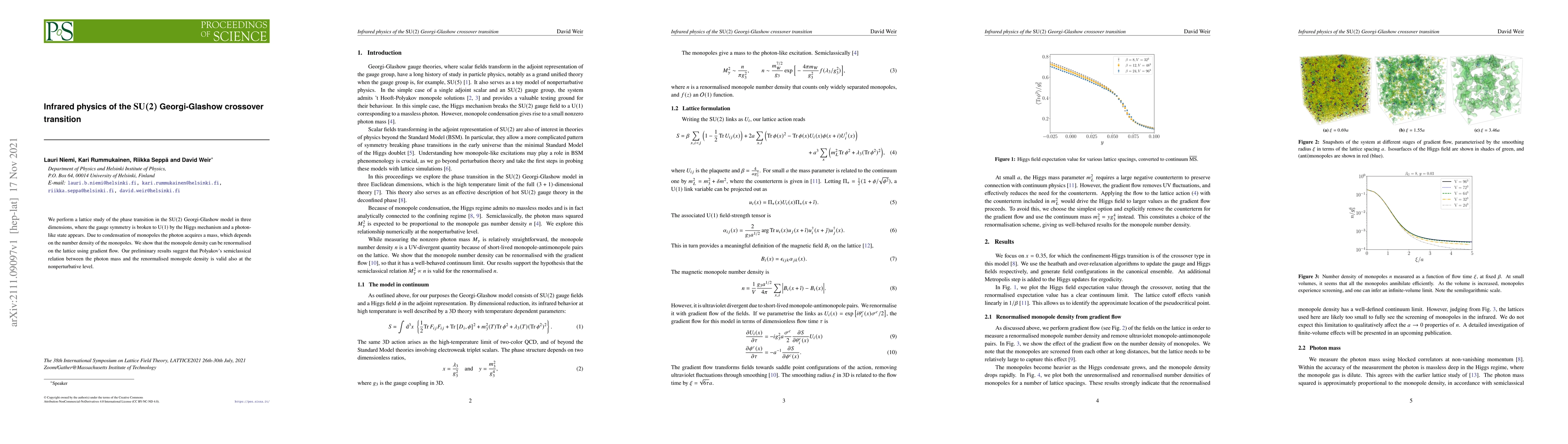 We perform a lattice study of the phase transition in the $\mathrm{SU}(2)$ Georgi-Glashow model in three dimensions, where the gauge symmetry is broken to $\mathrm{U}(1)$ by the Higgs mechanism and a photon-like state appears. Due to condensation of monopoles the photon acquires a mass, which depends on the number density of the monopoles. We show that the monopole density can be renormalised on the lattice using gradient flow. Our preliminary results suggest that Polyakov's semiclassical relation between the photon mass and the renormalised monopole density is valid also at the nonperturbative level.