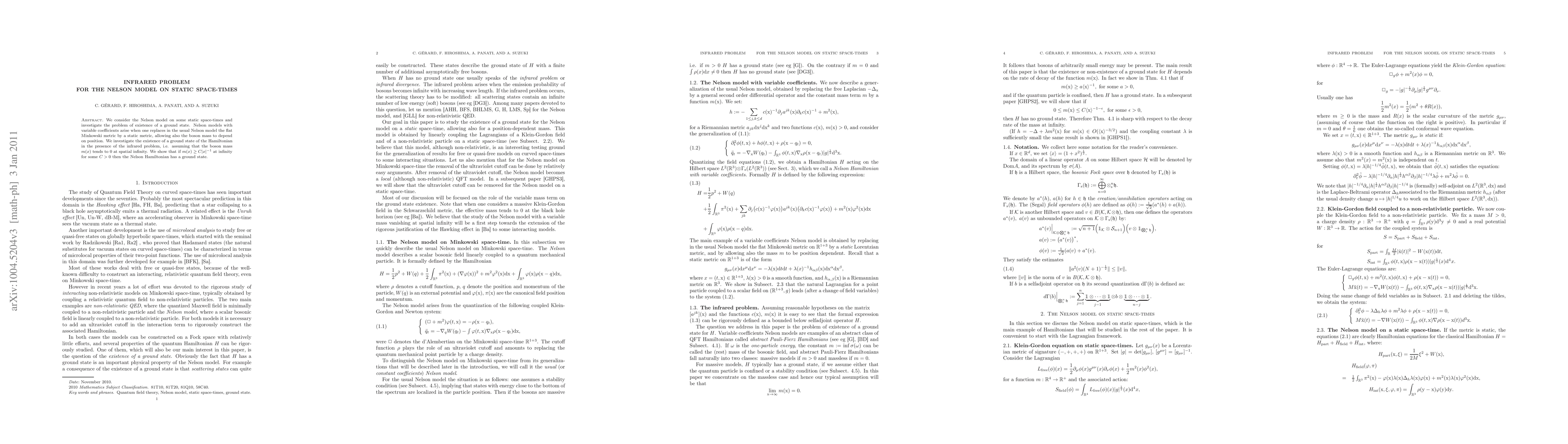 This paper examines the Nelson model with variable coefficients on static space-times, focusing on the existence of a ground state and the removal of ultraviolet cutoffs. It investigates the infrared problem where the boson mass approaches zero at infinity, relevant for quantizing the Klein-Gordon equation on static space-times.