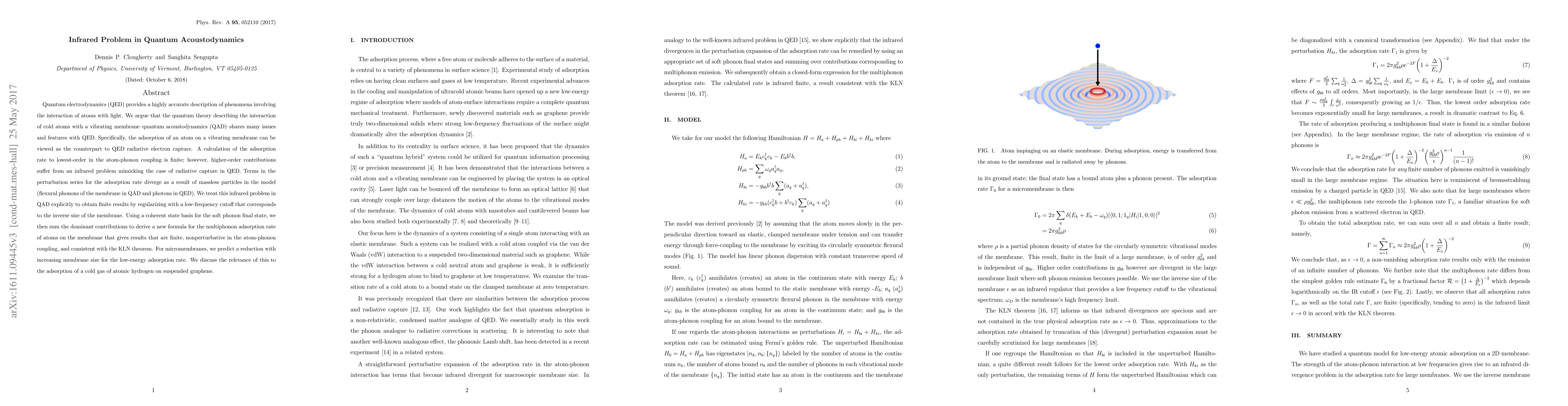 Quantum electrodynamics (QED) provides a highly accurate description of phenomena involving the interaction of atoms with light. We argue that the quantum theory describing the interaction of cold atoms with a vibrating membrane--quantum acoustodynamics (QAD)--shares many issues and features with QED. Specifically, the adsorption of an atom on a vibrating membrane can be viewed as the counterpart to QED radiative electron capture. A calculation of the adsorption rate to lowest-order in the atom-phonon coupling is finite; however, higher-order contributions suffer from an infrared problem mimicking the case of radiative capture in QED. Terms in the perturbation series for the adsorption rate diverge as a result of massless particles in the model (flexural phonons of the membrane in QAD and photons in QED). We treat this infrared problem in QAD explicitly to obtain finite results by regularizing with a low-frequency cutoff that corresponds to the inverse size of the membrane. Using a coherent state basis for the soft phonon final state, we then sum the dominant contributions to derive a new formula for the multiphonon adsorption rate of atoms on the membrane that gives results that are finite, nonperturbative in the atom-phonon coupling, and consistent with the KLN theorem. For micromembranes, we predict a reduction with increasing membrane size for the low-energy adsorption rate. We discuss the relevance of this to the adsorption of a cold gas of atomic hydrogen on suspended graphene.