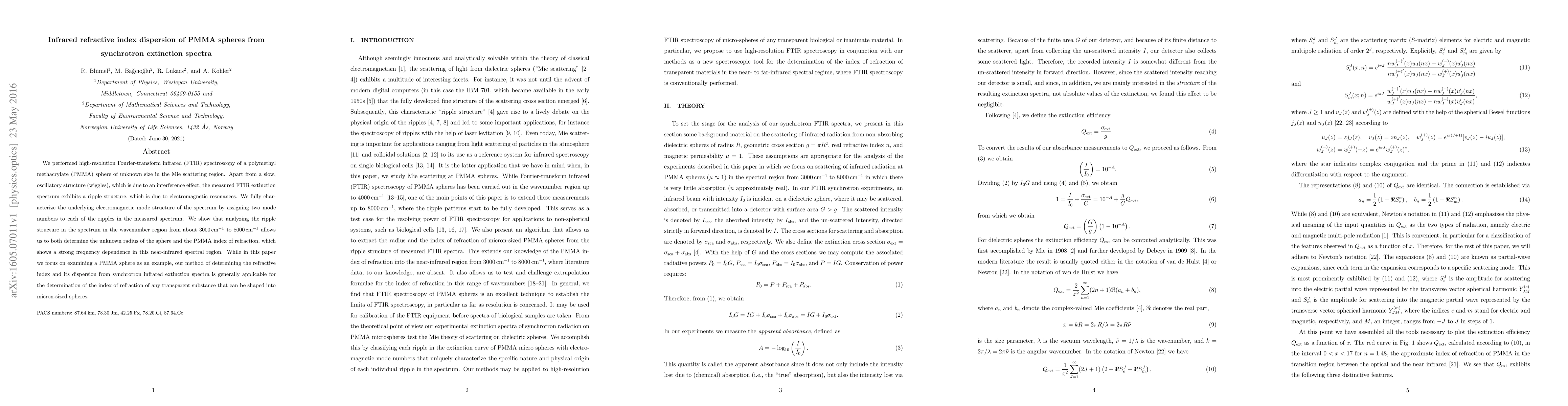This study uses high-resolution FTIR spectroscopy to determine the refractive index dispersion of PMMA spheres by analyzing their extinction spectra. The method reveals the sphere's radius and the frequency-dependent refractive index in the near-infrared region, demonstrating its general applicability for transparent materials.