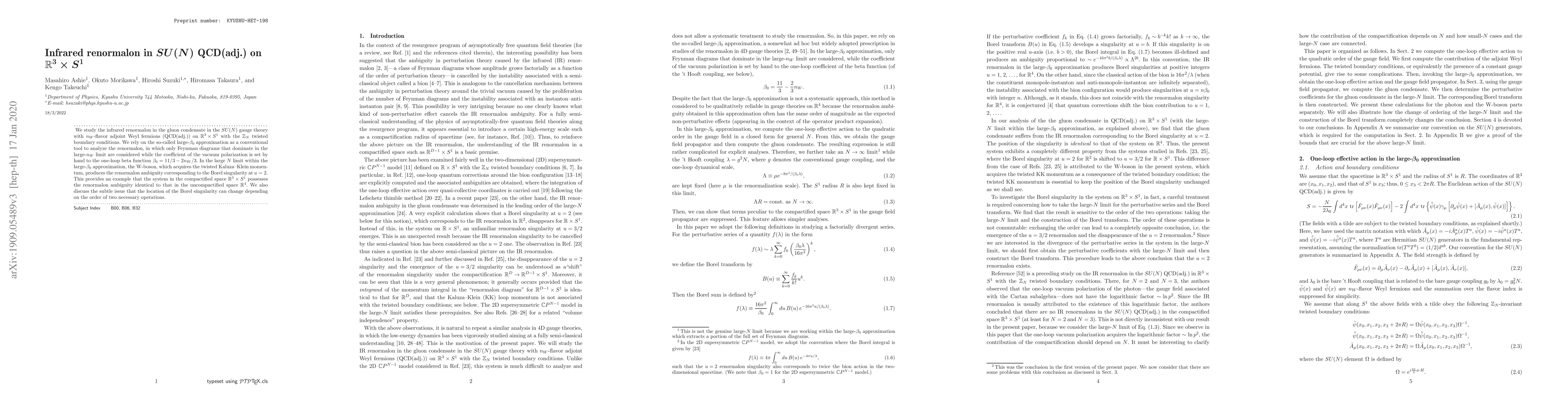 This paper investigates the infrared renormalon in the gluon condensate within $SU(N)$ QCD with adjoint Weyl fermions on $\mathbb{R}^3\times S^1$, revealing a renormalon ambiguity corresponding to a Borel singularity at $u=2$ in the large-$\beta_0$ approximation, similar to that in $\mathbb{R}^4$. It also discusses how the location of the Borel singularity may vary based on the order of operations.