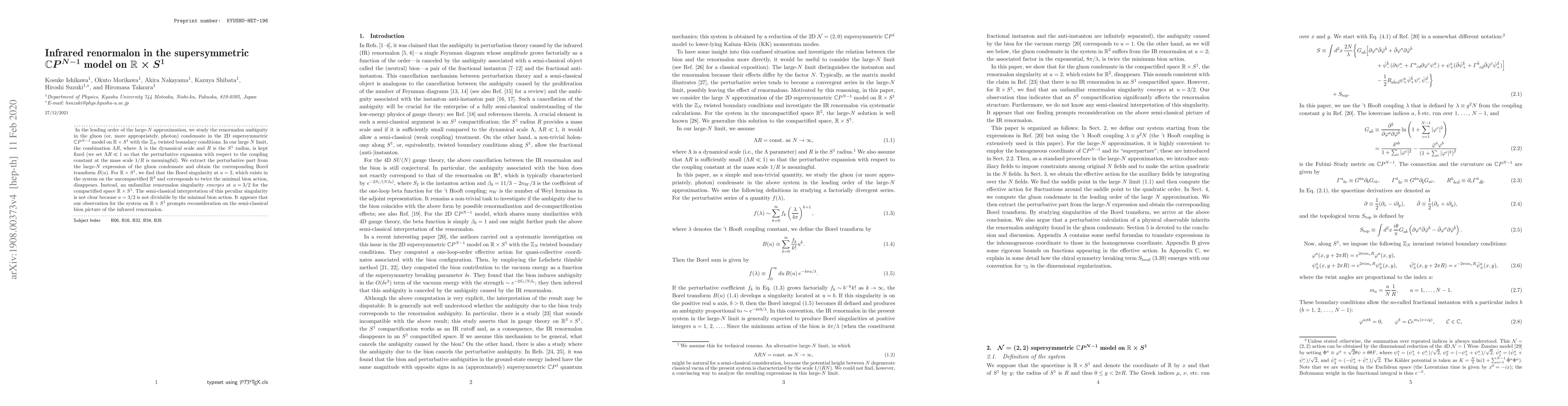 This paper investigates the infrared renormalon ambiguity in the supersymmetric $\mathbb{C}P^{N-1}$ model on $\mathbb{R}\times S^1$ within the large-$N$ approximation. The study finds that while a Borel singularity disappears on the compactified space, an unfamiliar renormalon singularity emerges at $u=3/2$, challenging the traditional semi-classical bion picture.