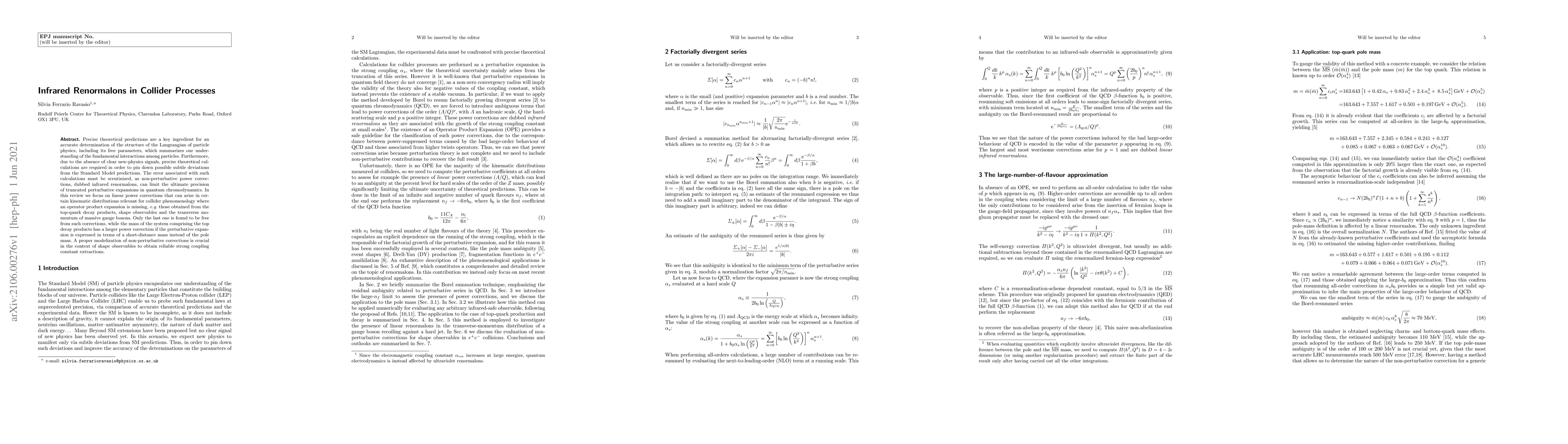 This paper reviews the impact of infrared renormalons on collider processes, emphasizing the importance of precise theoretical calculations to detect subtle deviations from Standard Model predictions. It finds that while certain kinematic distributions, like the transverse momentum of massive gauge bosons, are free from infrared renormalon corrections, others, such as the mass of top decay products, require careful modeling of non-perturbative power corrections for accurate strong coupling constant extractions.