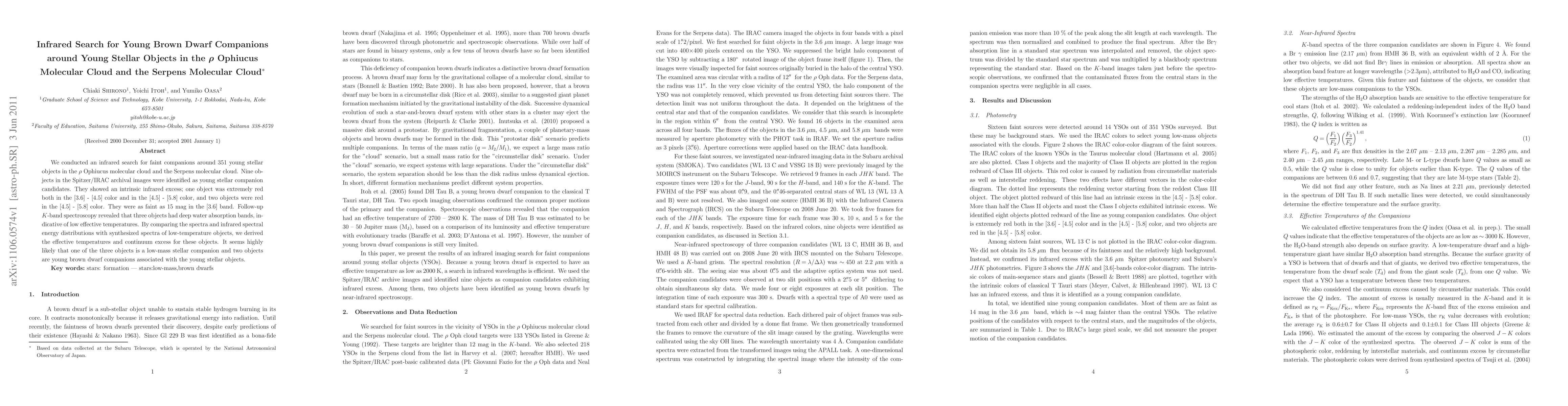 This study identified nine infrared companion candidates around 351 young stellar objects in the rho Ophiucus and Serpens molecular clouds, with three confirmed as low-mass stellar or brown dwarf companions based on their spectral characteristics and infrared excess.
