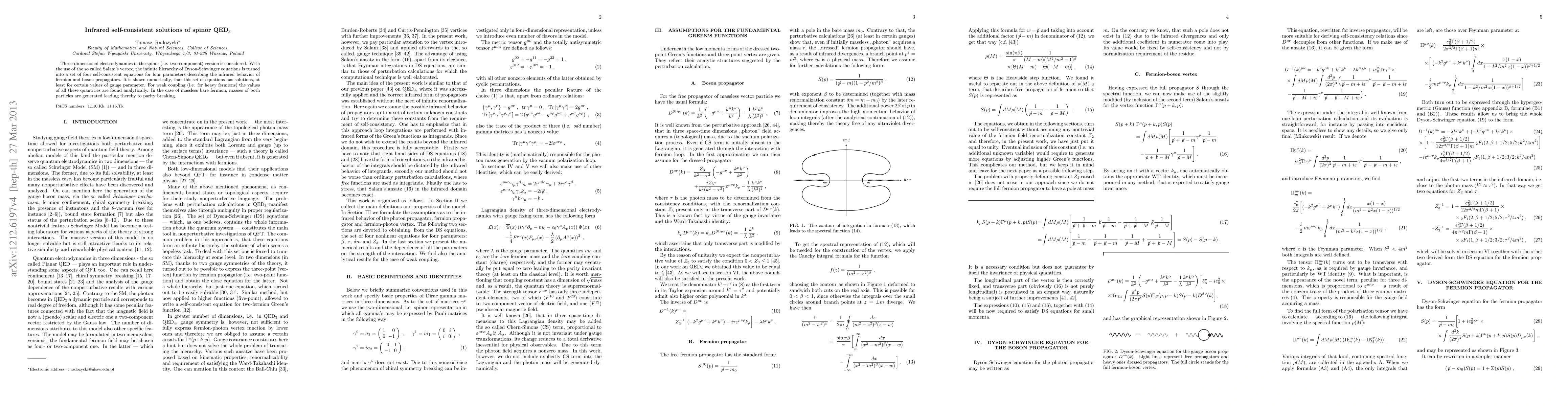 Researchers solved a set of equations for 3D spinor QED3, finding solutions that describe infrared behavior of fermion and boson propagators, leading to parity breaking in massless bare fermions.