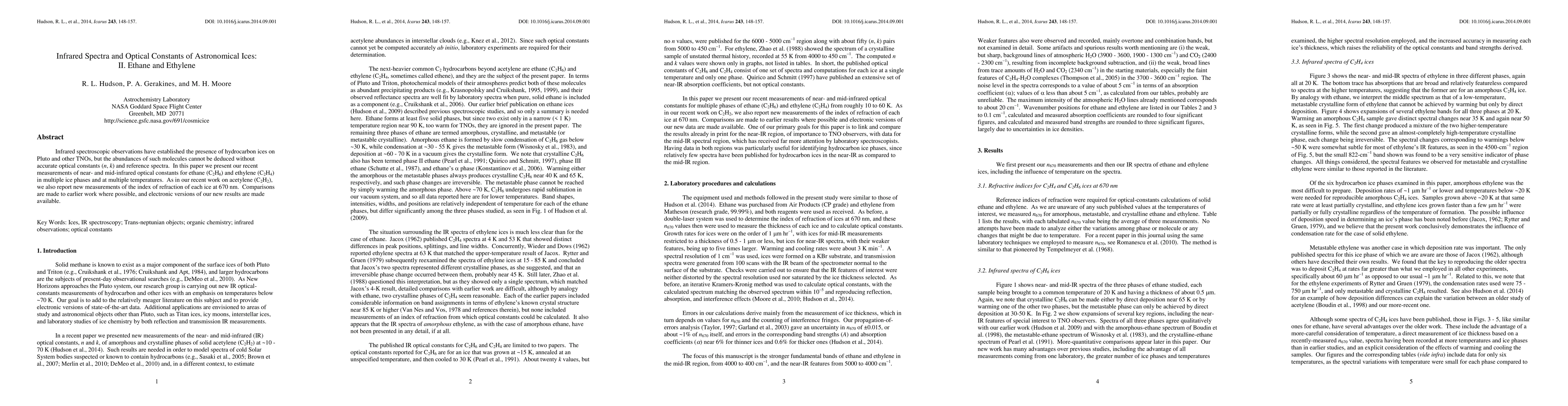 Infrared spectroscopic observations have established the presence of hydrocarbon ices on Pluto and other TNOs, but the abundances of such molecules cannot be deduced without accurate optical constants (n, k) and reference spectra. In this paper we present our recent measurements of near- and mid-infrared optical constants for ethane (C$_2$H$_6$) and ethylene (C$_2$H$_4$) in multiple ice phases and at multiple temperatures. As in our recent work on acetylene (C$_2$H$_2$), we also report new measurements of the index of refraction of each ice at 670 nm. Comparisons are made to earlier work where possible, and electronic versions of our new results are made available.