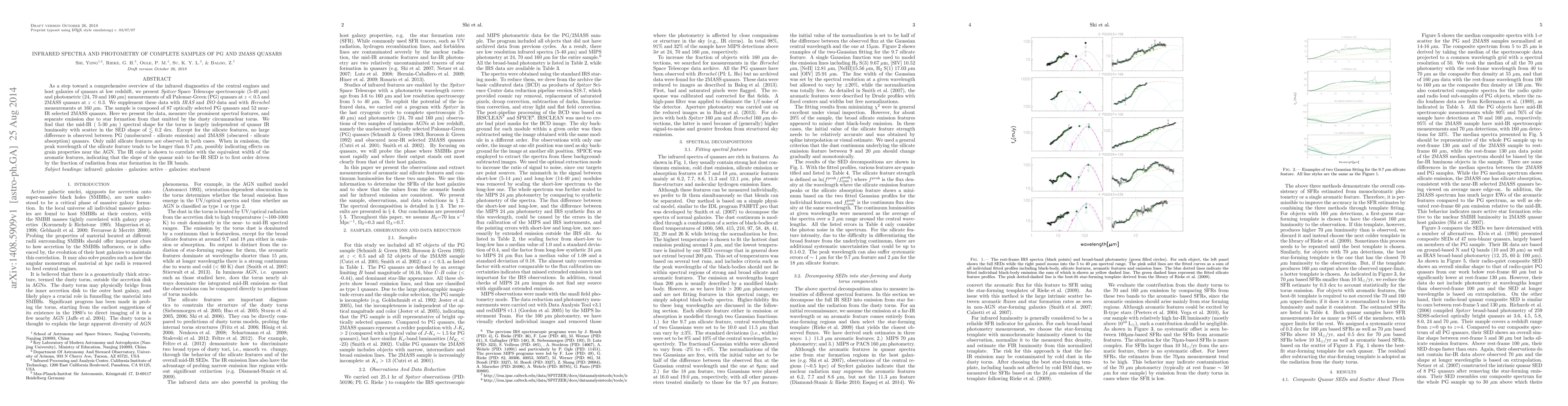 As a step toward a comprehensive overview of the infrared diagnostics of the central engines and host galaxies of quasars at low redshift, we present Spitzer Space Telescope spectroscopic (5-40 {\mu}m) and photometric (24, 70 and 160 {\mu}m) measurements of all Palomar-Green (PG) quasars at z < 0.5 and 2MASS quasars at z < 0.3. We supplement these data with Herschel measurements at 160 {\mu}m. The sample is composed of 87 optically selected PG quasars and 52 near-IR selected 2MASS quasars. Here we present the data, measure the prominent spectral features, and separate emission due to star formation from that emitted by the dusty circumnuclear torus. We find that the mid-IR (5-30 {\mu}m) spectral shape for the torus is largely independent of quasar IR luminosity with scatter in the SED shape of ~ 0.2 dex. Except for the silicate features, no large difference is observed between PG (unobscured - silicate emission) and 2MASS (obscured - silicate absorption) quasars. Only mild silicate features are observed in both cases. When in emission, the peak wavelength of the silicate feature tends to be longer than 9.7 {\mu}m, possibly indicating effects on grain properties near the AGN. The IR color is shown to correlate with the equivalent width of the aromatic features, indicating that the slope of the quasar mid- to far-IR SED is to first order driven by the fraction of radiation from star formation in the IR bands.