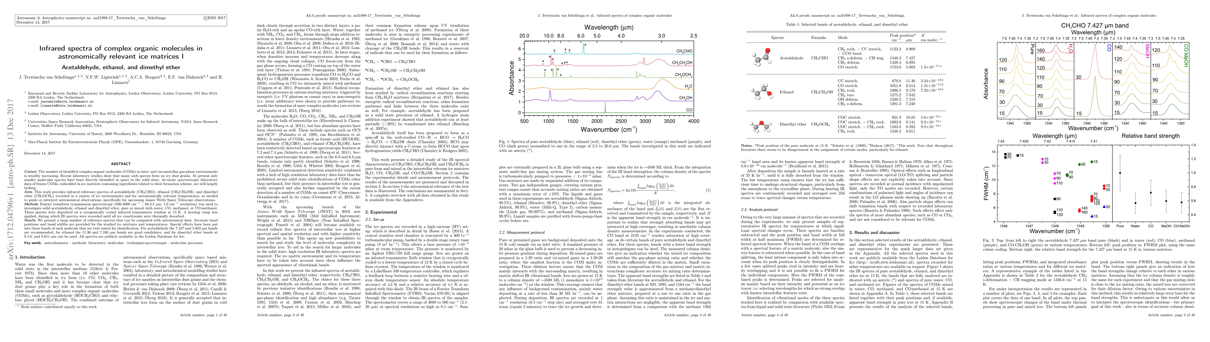 This paper provides infrared spectra for acetaldehyde, ethanol, and dimethyl ether embedded in various ice matrices, aiming to guide astronomical observations. The study uses Fourier transform spectroscopy to record spectra at 15 K and relevant temperatures, offering detailed band positions and widths for these complex organic molecules.