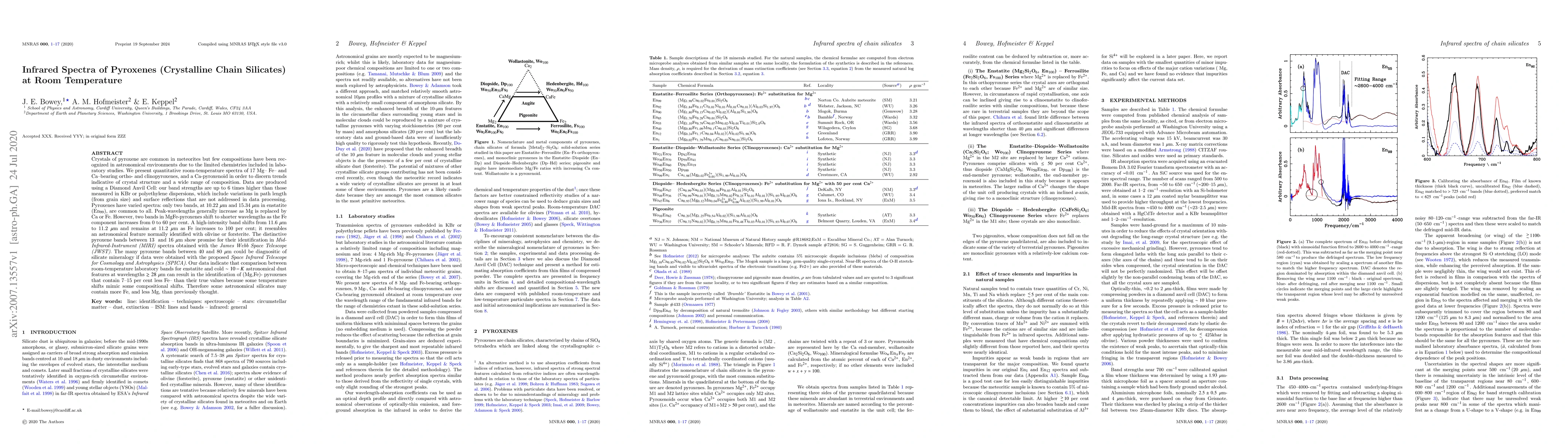 Pyroxene crystals are common in meteorites but few compositions have been recognized in astronomical environments. We present quantitative room-temperature spectra of 17 Mg-- Fe-- and Ca--bearing ortho- and clinopyroxenes, and a Ca-pyroxenoid in order to discern trends indicative of crystal structure and a wide range of composition. Data are produced using a Diamond Anvil Cell: our band strengths are up to 6 times higher than those measured in KBr or polyethylene dispersions, which include variations in path length (from grain size) and surface reflections that are not addressed in data processing. Pyroxenes have varied spectra: only two bands, at 10.22~$\mu$m and 15.34~$\mu$m in enstatite (En$_{99}$), are common to all. Peak-wavelengths generally increase as Mg is replaced by Ca or Fe. However, two bands in MgFe-pyroxenes shift to shorter wavelengths as the Fe component increases from 0 to 60 per cent. A high-intensity band shifts from 11.6~$\mu$m to 11.2~$\mu$m and remains at 11.2~$\mu$m as Fe increases to 100~per~cent; it resembles an astronomical feature normally identified with olivine or forsterite. The distinctive pyroxene bands between 13~ and 16~$\mu$m show promise for their identification in MIRI spectra obtained with JWST. The many pyroxene bands between 40 and 80~$\mu$m could be diagnositic of silicate mineralogy if data were obtained with the proposed SPICA telescope. Our data indicate that comparison between room-temperature laboratory bands for enstatite and cold $\sim 10-K$ astronomical dust features at wavelengths $\gtrsim 28~\mu$m can result in the identification of (Mg,Fe)- pyroxenes that contain 7--15 % less Fe-- than their true values because some temperature shifts mimic some compositional shifts. Therefore some astronomical silicates may contain more Fe, and less Mg, than previously thought.
