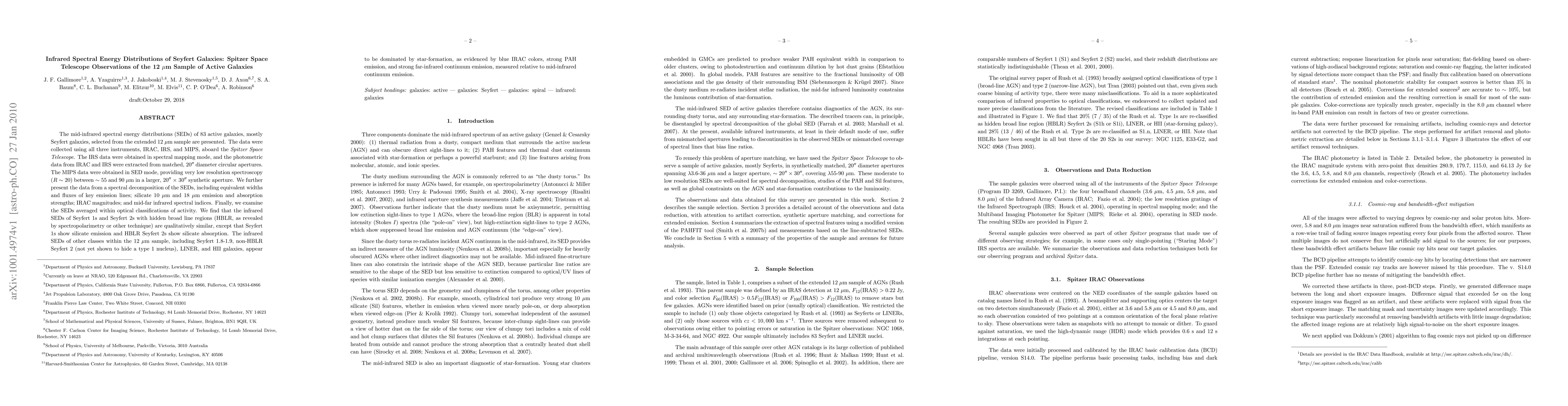 This study presents mid-far infrared spectral energy distributions (SEDs) of 83 active galaxies, mostly Seyfert types, using Spitzer Space Telescope data. The findings reveal that Seyfert 1s and hidden broad line region (HBLR) Seyfert 2s share similar infrared SEDs, with the key difference being silicate emission in Seyfert 1s and absorption in HBLR Seyfert 2s.
