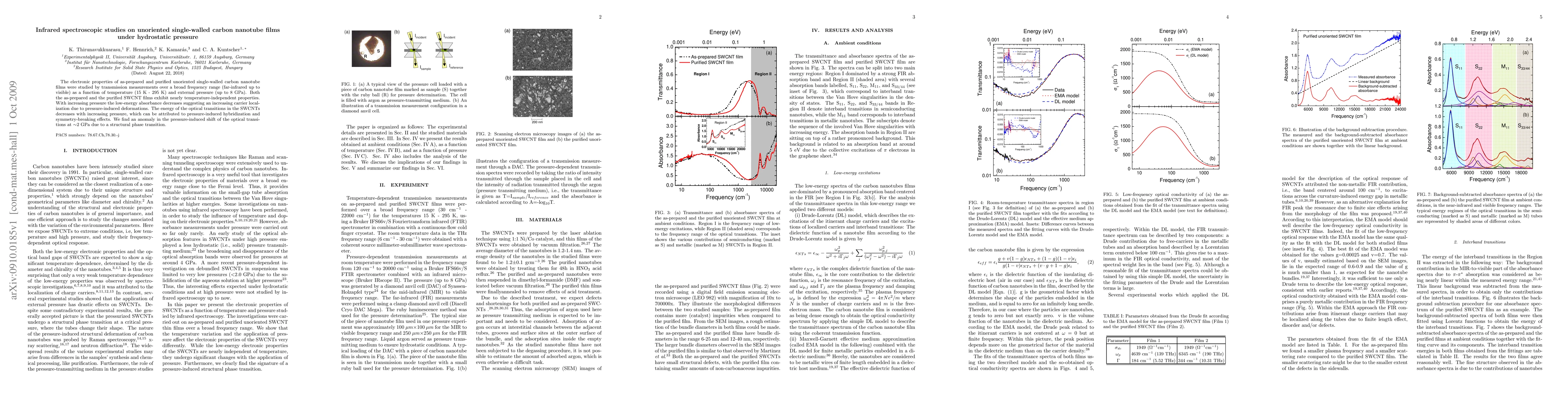 The electronic properties of as-prepared and purified unoriented single-walled carbon nanotube films were studied by transmission measurements over a broad frequency range (far-infrared up to visible) as a function of temperature (15 K - 295 K) and external pressure (up to 8 GPa). Both the as-prepared and the purified SWCNT films exhibit nearly temperature-independent properties. With increasing pressure the low-energy absorbance decreases suggesting an increasing carrier localization due to pressure-induced deformations. The energy of the optical transitions in the SWCNTs decreases with increasing pressure, which can be attributed to pressure-induced hybridization and symmetry-breaking effects. We find an anomaly in the pressure-induced shift of the optical transitions at $\sim$2 GPa due to a structural phase transition.