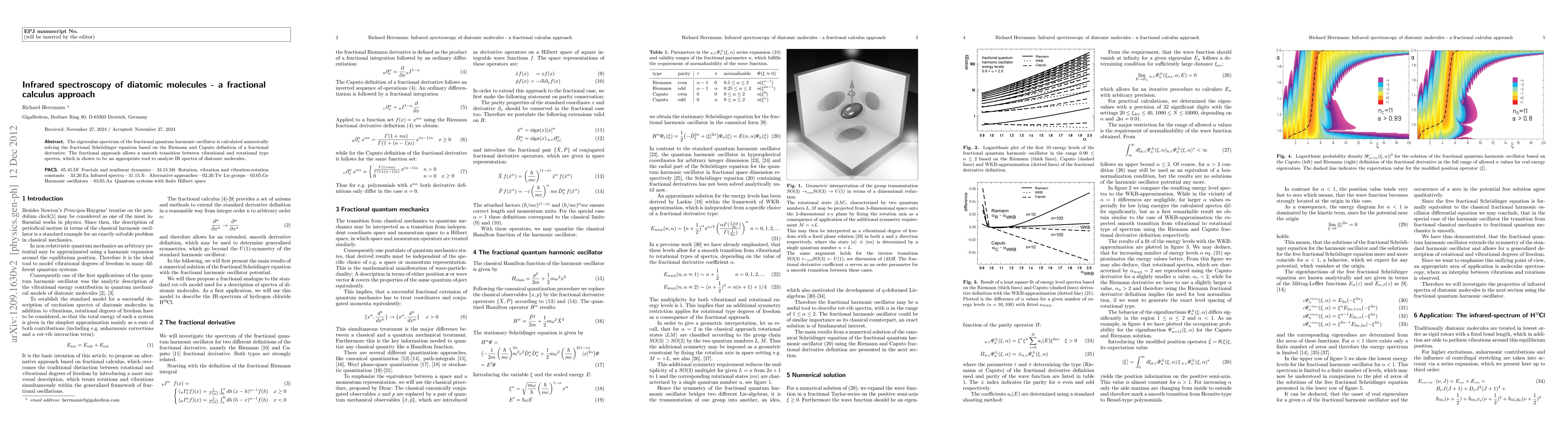 The eigenvalue spectrum of the fractional quantum harmonic oscillator is calculated numerically solving the fractional Schr\"odinger equation based on the Riemann and Caputo definition of a fractional derivative. The fractional approach allows a smooth transition between vibrational and rotational type spectra, which is shown to be an appropriate tool to analyze IR spectra of diatomic molecules.