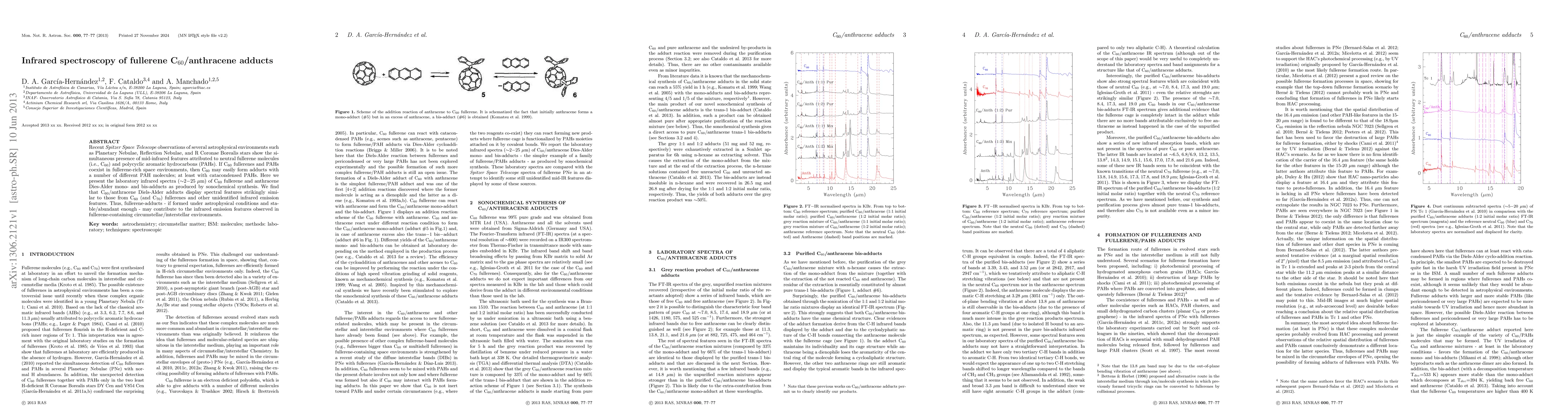 This study investigates the infrared spectra of C60 fullerene and anthracene adducts synthesized via sonochemical methods, revealing that C60/anthracene Diels-Alder adducts closely mimic the spectral features of C60 fullerenes. These findings suggest that fullerene-adducts could potentially contribute to infrared emission features observed in fullerene-rich astrophysical environments.