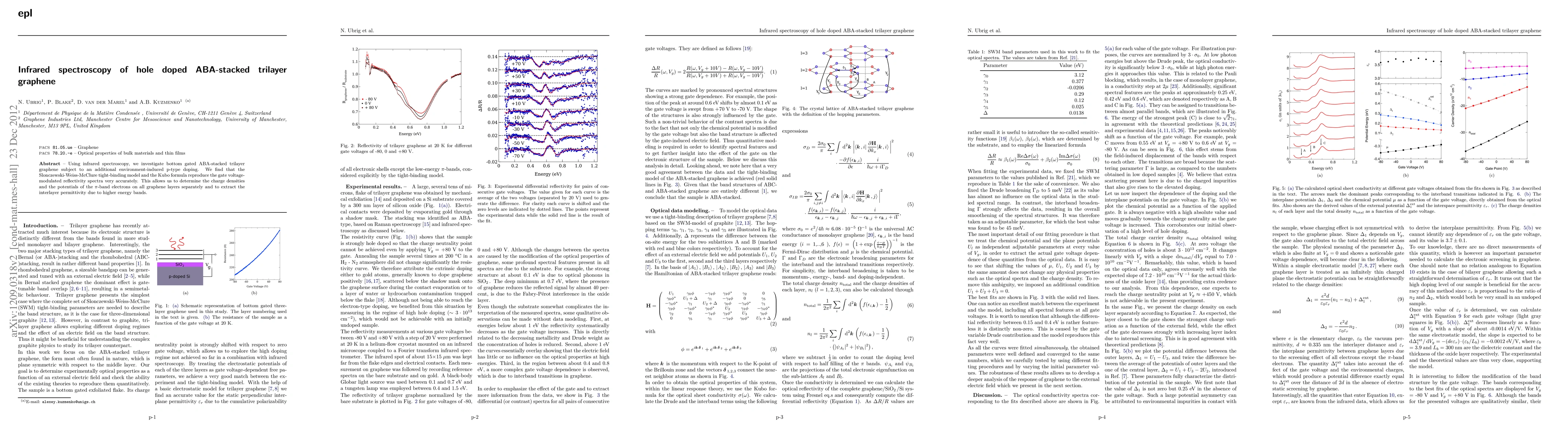 This study uses infrared spectroscopy to analyze p-type doped ABA-stacked trilayer graphene, revealing accurate reproduction of gate voltage-modulated spectra by the Slonczewski-Weiss-McClure model and the Kubo formula, which enables separate determination of charge densities and potentials for {\pi}-band electrons across the layers and the extraction of interlayer permittivity.