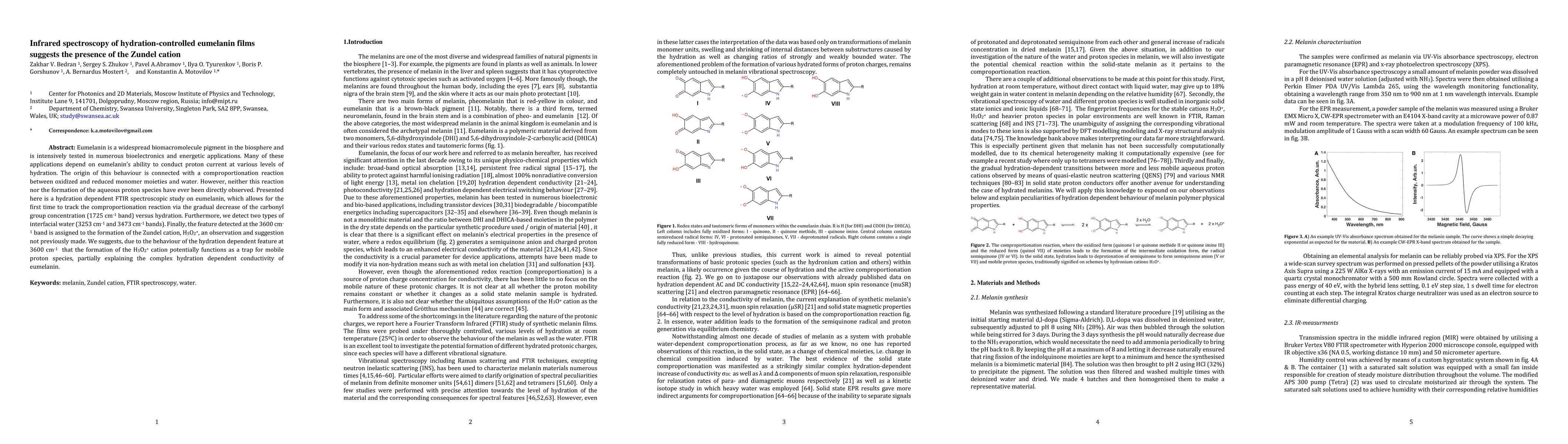 Eumelanin is a widespread biomacromolecule pigment in the biosphere and is intensively tested in numerous bioelectronics and energetic applications. Many of these applications depend on eumelanin's ability to conduct proton current at various levels of hydration. The origin of this behaviour is connected with a comproportionation reaction between oxidized and reduced monomer moieties and water. However, neither this reaction nor the formation of the aqueous proton species have ever been directly observed. Presented here is a hydration dependent FTIR spectroscopic study on eumelanin, which allows for the first time to track the comproportionation reaction via the gradual decrease of the carbonyl group concentration (1725 $cm^{-1}$ band) versus hydration. Furthermore, we detect two types of interfacial water (3253 $cm^{-1}$ and 3473 $cm^{-1}$ bands). Finally, the feature detected at the 3600 $cm^{-1}$ band is assigned to the formation of the Zundel cation, $H_5O_2^+$, an observation and suggestion not previously made. We suggests, due to the behaviour of the hydration dependent feature at 3600 $cm^{-1}$ that the formation of the $H_5O_2^+$ cation potentially functions as a trap for mobile proton species, partially explaining the complex hydration dependent conductivity of eumelanin.