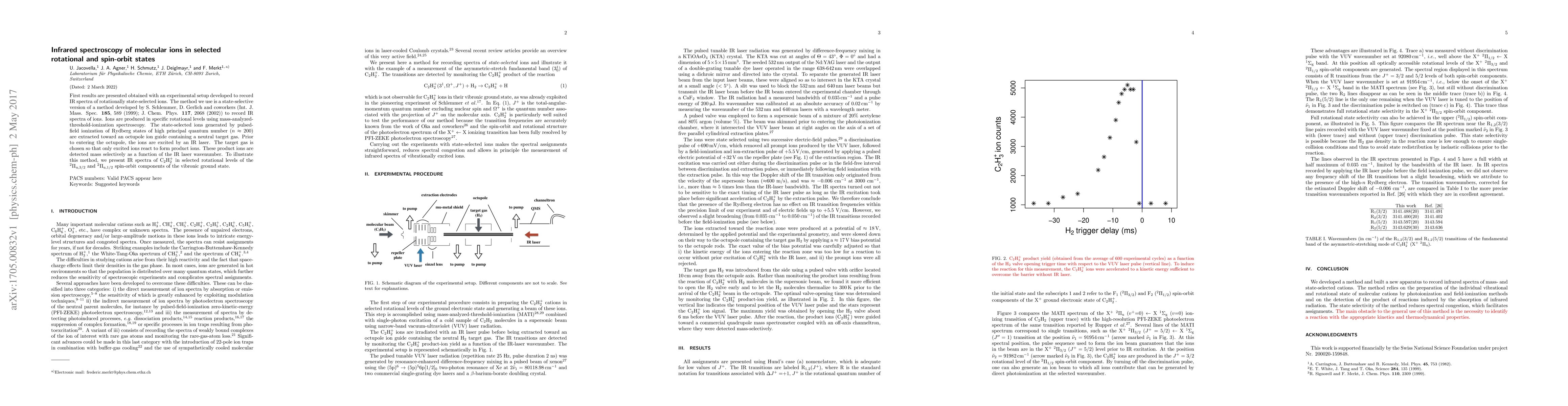 This paper reports on an experimental setup for recording infrared (IR) spectra of rotationally state-selected molecular ions, utilizing a method developed by Schlemmer et al. The study presents IR spectra of C$_2$H$_2^+$ in specific rotational and spin-orbit states, demonstrating the technique's capability to analyze ions in defined quantum states.