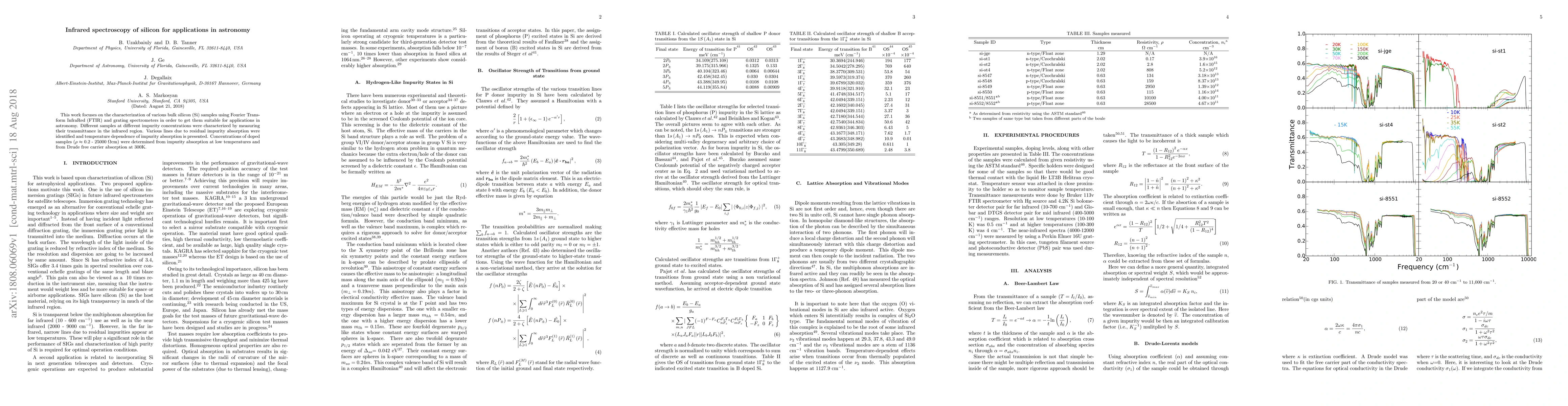 Researchers used infrared spectroscopy to characterize silicon samples for astronomy applications, identifying impurity absorption lines and determining concentrations of doped samples.