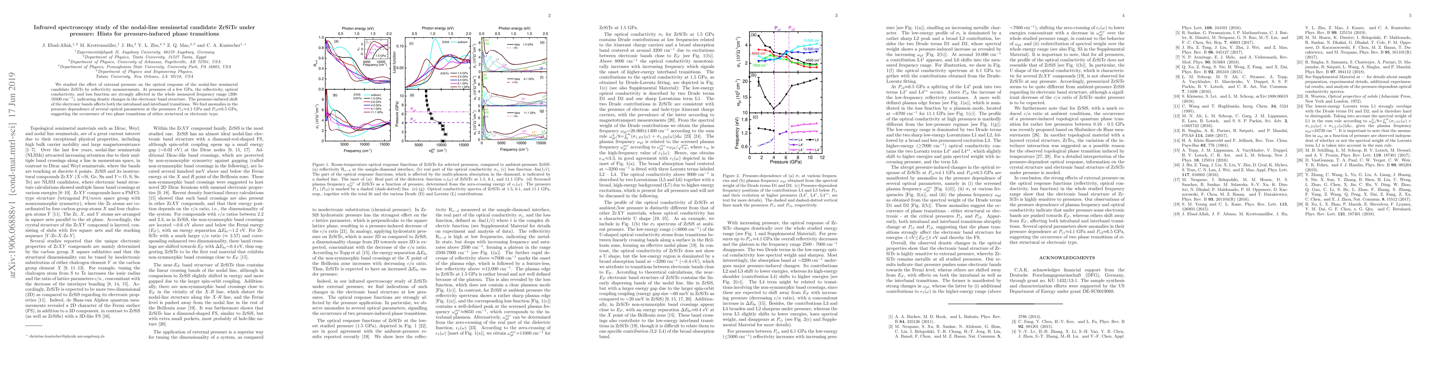 This study reveals that applying pressure to ZrSiTe, a nodal-line semimetal candidate, significantly alters its optical response, indicating changes in the electronic band structure. Anomalies in optical parameters at pressures around 4.1 GPa and 6.5 GPa suggest two potential phase transitions.