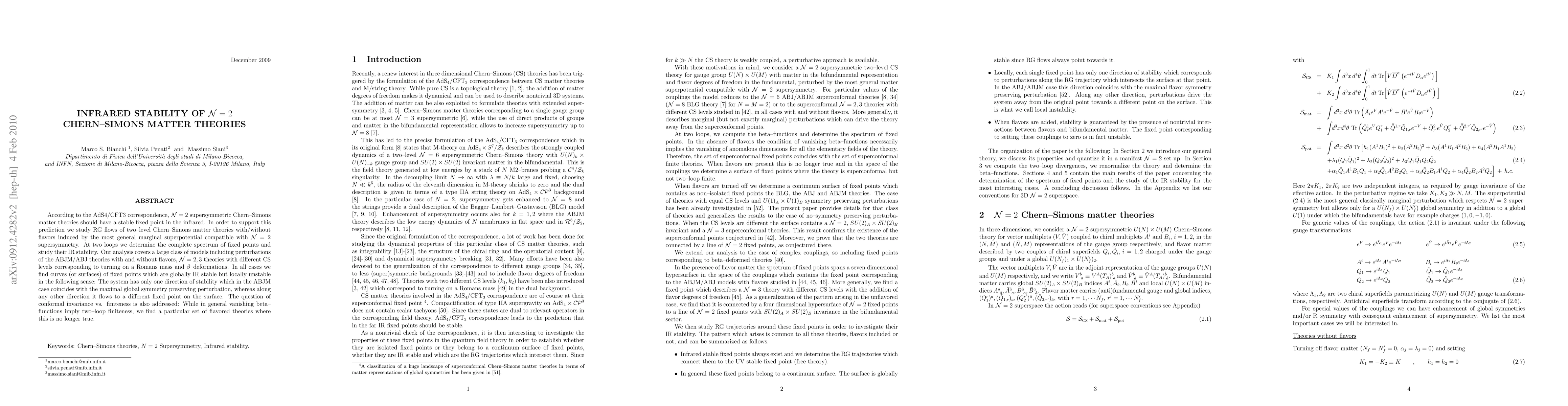 According to the AdS4/CFT3 correspondence, N=2 supersymmetric Chern-Simons matter theories should have a stable fixed point in the infrared. In order to support this prediction we study RG flows of two-level Chern-Simons matter theories with/without flavors induced by the most general marginal superpotential compatible with N=2 supersymmetry. At two loops we determine the complete spectrum of fixed points and study their IR stability. Our analysis covers a large class of models including perturbations of the ABJM/ABJ theories with and without flavors, N=2,3 theories with different CS levels corresponding to turning on a Romans mass and beta-deformations. In all cases we find curves (or surfaces) of fixed points which are globally IR stable but locally unstable in the following sense: The system has only one direction of stability which in the ABJM case coincides with the maximal global symmetry preserving perturbation, whereas along any other direction it flows to a different fixed point on the surface. The question of conformal invariance vs. finiteness is also addressed: While in general vanishing beta-functions imply two-loop finiteness, we find a particular set of flavored theories where this is no longer true.