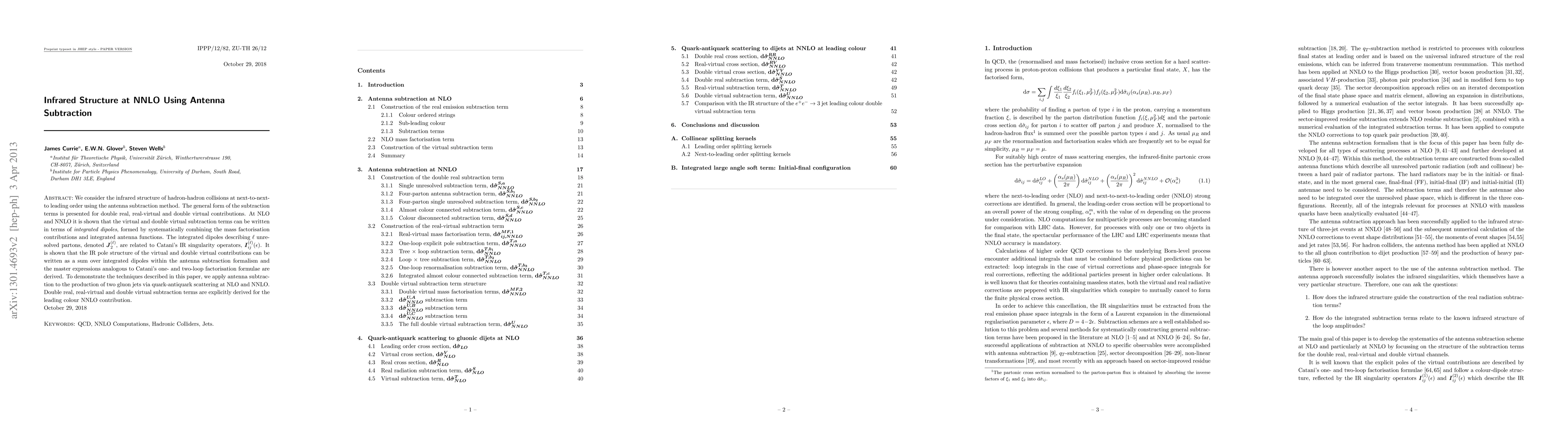 We consider the infrared structure of hadron-hadron collisions at next-to-next-to leading order using the antenna subtraction method. The general form of the subtraction terms is presented for double real, real-virtual and double virtual contributions. At NLO and NNLO it is shown that the virtual and double virtual subtraction terms can be written in terms of integrated dipoles, formed by systematically combining the mass factorisation contributions and integrated antenna functions. The integrated dipoles describing $\ell$ unresolved partons, denoted $\bs{J}_{2}^{(\ell)}$, are related to Catani's IR singularity operators, $\bs{I}_{ij}^{(\ell)}(\eps)$. It is shown that the IR pole structure of the virtual and double virtual contributions can be written as a sum over integrated dipoles within the antenna subtraction formalism and the master expressions analogous to Catani's one- and two-loop factorisation formulae are derived. To demonstrate the techniques described in this paper, we apply antenna subtraction to the production of two gluon jets via quark-antiquark scattering at NLO and NNLO. Double real, real-virtual and double virtual subtraction terms are explicitly derived for the leading colour NNLO contribution.
