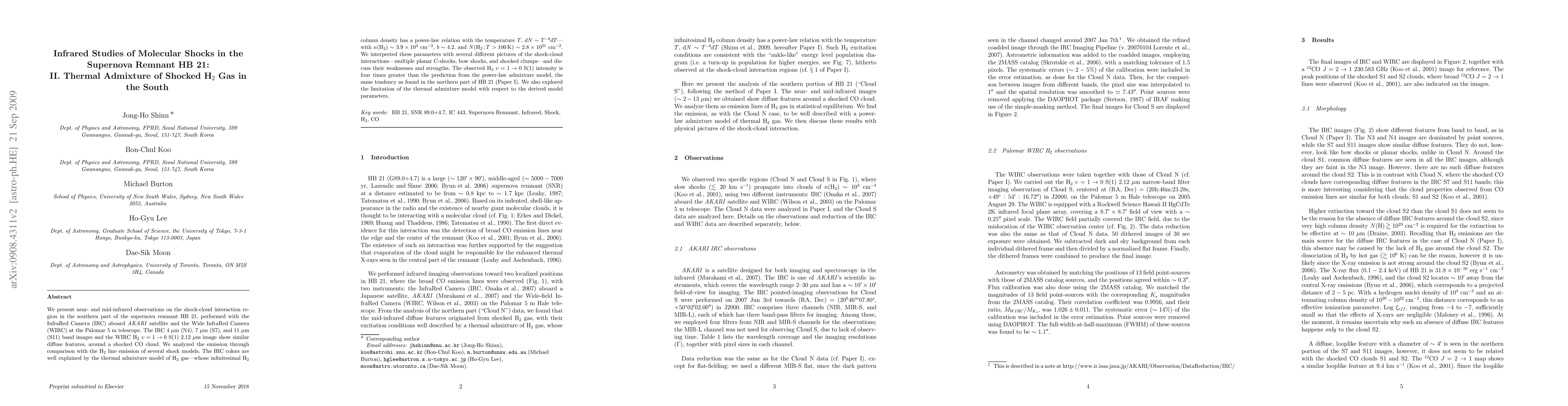 This paper presents infrared observations of the shock-cloud interaction region in the southern part of supernova remnant HB 21, revealing the thermal admixture of shocked H$_2$ gas. The study finds that the IRC and WIRC data align well with a thermal admixture model, though the observed H2 emission intensity is four times greater than predicted, indicating limitations in the model.