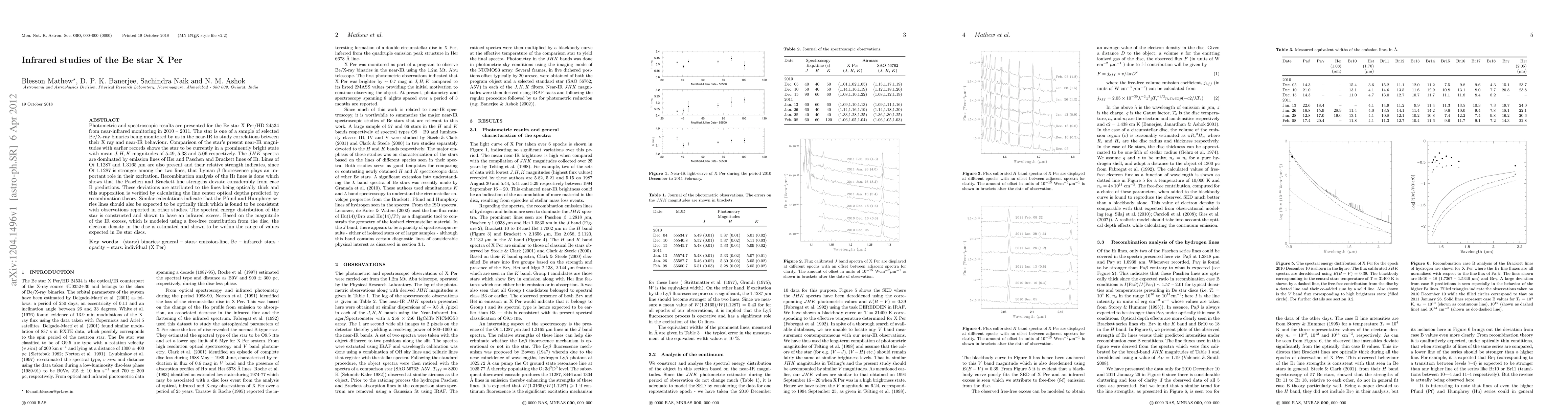 Photometric and spectroscopic results are presented for the Be star X Per/HD 24534 from near-infrared monitoring in 2010-2011. The star is one of a sample of selected Be/X-ray binaries being monitored by us in the near-IR to study correlations between their X ray and near-IR behaviour. Comparison of the star's present near-IR magnitudes with earlier records shows the star to be currently in a prominently bright state with mean J, H, K magnitudes of 5.49, 5.33 and 5.06 respectively. The JHK spectra are dominated by emission lines of HeI and Paschen and Brackett lines of HI. Lines of OI 1.1287 and 1.3165 micron are also present and their relative strength indicates, since OI 1.1287 is stronger among the two lines, that Lyman beta fluorescence plays an important role in their excitation. Recombination analysis of the HI lines is done which shows that the Paschen and Brackett line strengths deviate considerably from case B predictions. These deviations are attributed to the lines being optically thick and this supposition is verified by calculating the line center optical depths predicted by recombination theory. Similar calculations indicate that the Pfund and Humphrey series lines should also be expected to be optically thick which is found to be consistent with observations reported in other studies. The spectral energy distribution of the star is constructed and shown to have an infrared excess. Based on the magnitude of the IR excess, which is modeled using a free-free contribution from the disc, the electron density in the disc is estimated and shown to be within the range of values expected in Be star discs.