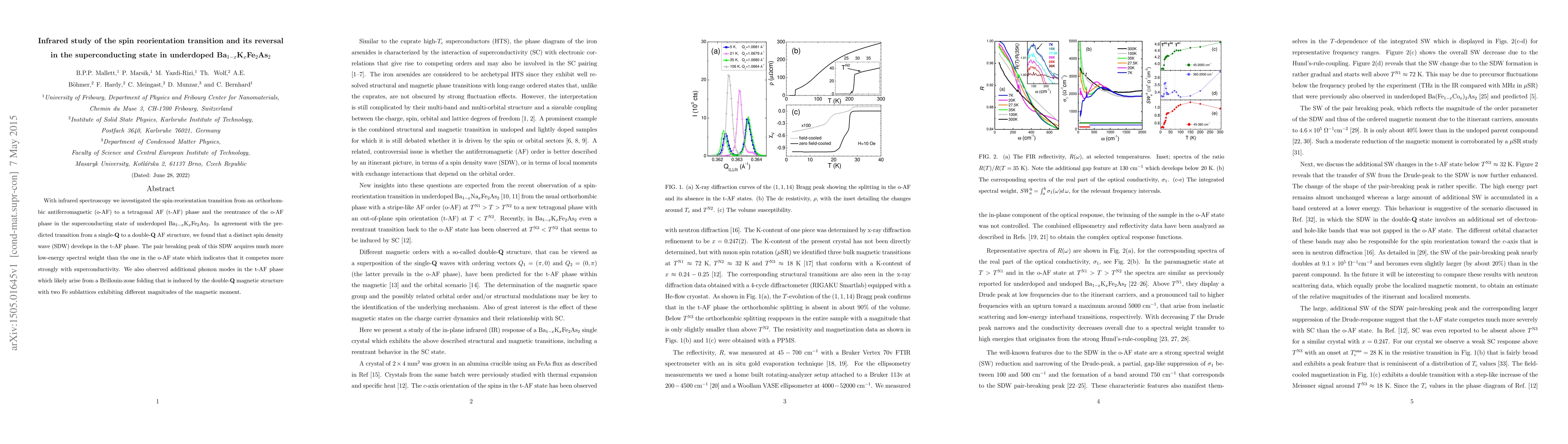 With infrared spectroscopy we investigated the spin-reorientation transition from an orthorhombic antiferromagnetic (o-AF) to a tetragonal AF (t-AF) phase and the reentrance of the o-AF phase in the superconducting state of underdoped Ba$ _{1-x} $K$ _{x} $Fe$ _{2} $As$ _{2} $. In agreement with the predicted transition from a single-$\mathbf{Q}$ to a double-$\mathbf{Q}$ AF structure, we found that a distinct spin density wave (SDW) develops in the t-AF phase. The pair breaking peak of this SDW acquires much more low-energy spectral weight than the one in the o-AF state which indicates that it competes more strongly with superconductivity. We also observed additional phonon modes in the t-AF phase which likely arise from a Brillouin-zone folding that is induced by the double-$\mathbf{Q}$ magnetic structure with two Fe sublattices exhibiting different magnitudes of the magnetic moment.